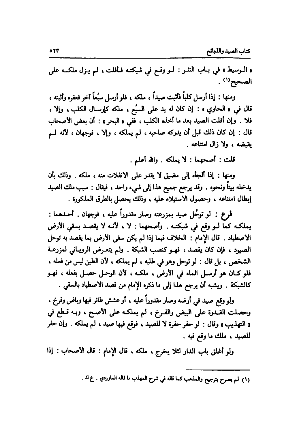 الوسيط في باب النثر: لو وقع في شبكته فأفلت، لم يزل ملكه على الصحيح. ومنها: إذا أرسل كلبا فأثبت صيدا، ملكه، فلو أرسل سبعا آخر فعقره وأثبته، قال في الحاوي: إن كان له يد على السبع، ملكه كإرسال الكلب، وإلا، فلا. وإن أفلت الصيد بعد ما أخذه الكلب، ففي البحر: أن بعض الاصحاب قال: إن كان ذلك قبل أن يدركه صاحبه، لم يملكه، وإلا، فوجهان، لانه لم يقبضه، ولا زال امتناعه. قلت: أصحهما: لا يملكه. والله أعلم. ومنها: إذا ألجأه إلى مضيق لا يقدر على الانفلات منه، ملكه. وذلك بأن يدخله بيتا ونحوه. وقد يرجع جميز هذا إلى شئ واحد، فيقال: سبب ملك الصيد إبطال امتناعه، وحصول الاستيلاء عليه، وذلك يحصل بالطرق المذكورة. فرع لو توحل صيد بمزرعته وصار مقدورا عليه فوجهان. أحدهما: يملكه كما لو وقع في شبكته. وأصحهما: لا، لان لا يقصد بسقي الارض الاصطياد. قال الامام: الخلاف فيما إذا لم يكن سقى الارض بما يقصد به توحل الصيود، فإن كان يقصد، فهو كنصب الشبكة. ولم يتعرض الروياني لمزرعة الشخص، بل قال: لو توحل وهو في طلبه، لم يملكه، لان الطين ليس من فعله. فلو كان هو أرسل الماء في الارض، ملكه، لان الوحل حصل بفعله، فهو كالشبكة. ويشبه أن يرجع هذا إلى ما ذكره الامام من قصد الاصطياد بالسقي. ولو وقع صيد في أرضه وصار مقدورا عليه، أو عشش طائر فيها وباض وفرخ، وحصلت القدرة على البيض والفرخ، لم يملكه على الاصح، وبه قطع في التهذيب وقال: لو حفر حفرة لا للصيد، فوقع فيها صيد، لم يملكه. وإن حفر للصيد، ملك ما وقع فيه. ولو أغلق باب الدار لئلا يخرج، ملكه، قال الامام: قال الاصحاب: إذا