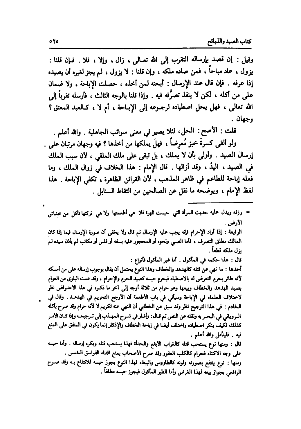وقيل: إن قصد بإرساله التقرب إلى الله تعالى، زال، وإلا، فلا. فإن قلنا: يزول، عاد مباحا، فمن صاده ملكه، وإن قلنا: لا يزول، لم يجز لغيره أن يصيده إذا عرفه. فإن قال عند الارسال: أبحته لمن أخذه، حصلت الاباحة، ولا ضمان على من أكله، لكن لا ينفذ تصرفه فيه. وإذا قلنا بالوجه الثالث، فأرسله تقربا إلى الله تعالى، فهل يحل اصطياده لرجوعه إلى الاباحة، أم لا، كالعبد المعتق ؟ وجهان. قلت: الاصح: الحل، لئلا يصير في معنى سوائب الجاهلية. والله أعلم. ولو ألقى كسرة خبز معرضا، فهل يملكها من أخذها ؟ فيه وجهان مرتبان على إرسال الصيد. وأولى بأن لا يملك، بل تبقى على ملك الملقي، لان سبب الملك في الصيد، اليد، وقد أزالها. قال الامام: هذا الخلاف في زوال الملك، وما فعله إباحة للطاعم في ظاهر المذهب، لان القرائن الظاهرة، تكفي الاباحة. هذا لفظ الامام، ويوضحه ما نقل عن الصالحين من التقاط السنابل.