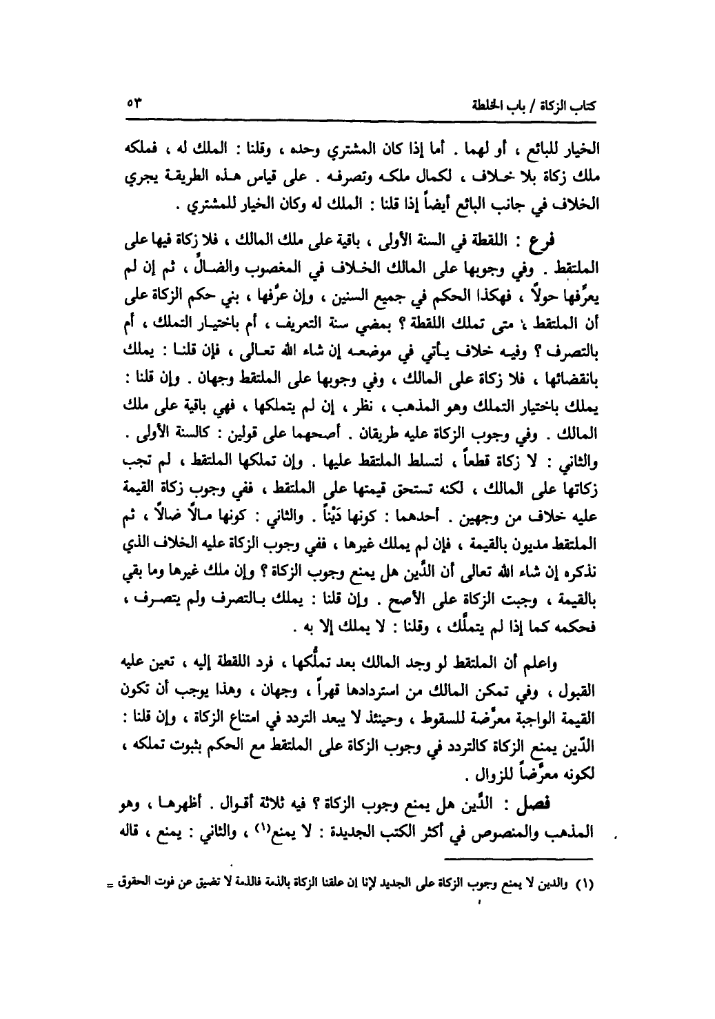 الخيار للبائع، أو لهما. أما إذا كان المشتري وحده، وقلنا: الملك له، فملكه ملك زكاة بلا خلاف، لكمال ملكه وتصرفه. وعلى قياس هذه الطريقة يجري الخلاف في جانب البائع أيضا إذا قلنا: الملك له وكان الخيار للمشتري. فرع اللقطة في السنة الاولى، باقية على ملك المالك، فلا زكاة فيها على الملتقط. وفي وجوبها على المالك الخلاف في المغصوب والضال، ثق إن لم يعرفها حولا، فهكذا الحكم في جميع السنين، وإن عرفها، بني حكم الزكاة على أن الملتقط، متى تملك اللقطة ؟ بمضي سنة التعريف، أم باختيار التملك، أم بالتصرف ؟ فيه خلاف يأتي في موضعه إن شاء الله تعالى، فإن قلنا: يملك بانقضائها، فلا زكاة على المالك، وفي وجوبها على الملتقط وجهان. وإن قلنا: يملك باختيار التملك وهو المذهب، نظر، إن لم يتملكها، فهي باقية على ملك المالك. وفي وجوب الزكاة عليه طريقان. أصحهما على قولين: كالسنة الاولى. والثاني: لا زكاة قطعا، لتسلط الملتقط عليها. وإن تملكها الملتقط، لم تجب زكاتها على المالك، لكنه تستحق قيمتها على الملتقط، ففي وجوب زكاة القيمة عليه خلاف من وجهين. أحدهما: كونها دينا. والثاني: كونها مالا ضالا. ثم الملتقط مديون بالقيمة، فإن لم يملك غيرها، ففي وجوب الزكاة عليه الخلاف الذي نذكره إن شاء الله تعالى أن الدين هل يمنع وجوب الزكاة ؟ وإن ملك غيرها وما بقي بالقيمة، وجبت الزكاة على الاصح. وإن قلنا: يملك بالتصرف ولم يتصرف، فحكمه كما إذا لم يتملك، وقلنا: لا يملك إلا به. واعلم أن الملتقط لو وجد المالك بعد تملكها، فرد اللقطة إليه، تعين عليه القبول، وفي تمكن المالك من استردادها قهرا، وجهان، وهذا يوجب أن تكون القيمة الواجبة معرضة للسقوط، وحينئذ لا يبعد التردد في امتناع الزكاة، وإن قلنا: الدين يمنع الزكاة كالتردد في وجوب الزكاة على الملتقط مع الحكم بثبوت تملكه، لكونه معرضا للزوال. فصل الدين هل يمنع وجوب الزكاة ؟ فيه ثلاثة أقوال. أظهرها، وهو المذهب والمنصوص في أكثر الكتب الجديدة: لا يمنع، والثاني: يمنع، قاله