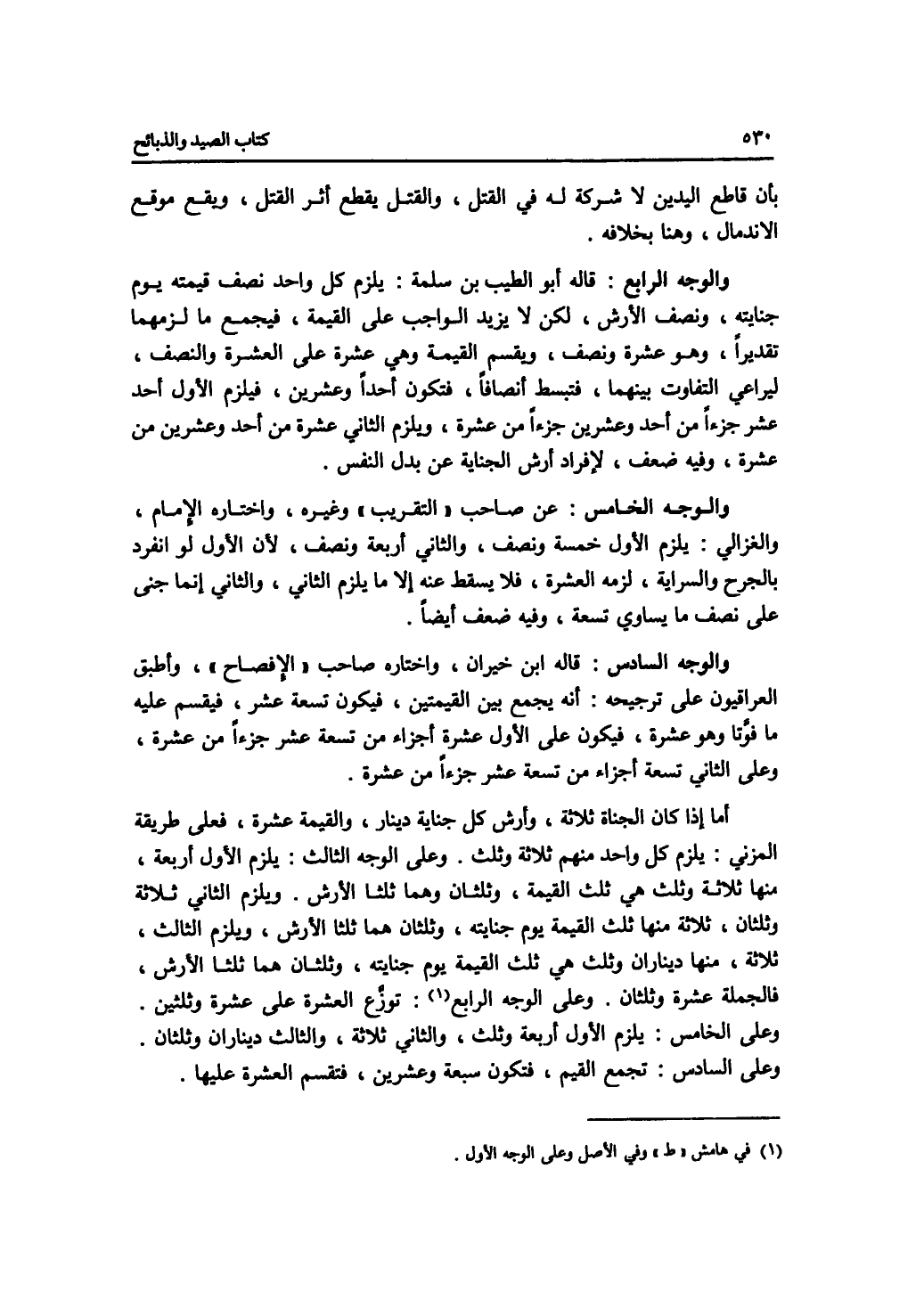 بأن قاطع اليدين لا شركة له في القتل، والقتل يقطع أثر القتل، ويقع موقع الاندمال، وهنا بخلافه. والوجه الرابع، قال أبو الطيب بن سلمة: يلزم كل واحد نصف قيمته يوم جنايته، ونصف الارش، لكن لا يزيد الواجب على القيمة، فيجمع ما لزمهما تقديرا، وهو عشرة ونصف، ويقسم القيمة وهي عشرة على العشرة والنصف، ليراعي التفاوت بينهما، فتبسط أنصافا، فتكون أحدا وعشرين، فيلزم الاول أحد عشر جزءا من أحد وعشرين جزءا من شرة، ويلزم الثاني عشرة من أحد وعشرين من عشرة، وفيه ضعف، لافراد أرش الجناية عن بدل النفس. والوجه الخامس، عن صاحب التقريب وغيره، واختاره الامام، والغزالي: يلزم الاول خمسة ونصف، والثاني أربعة ونصف، لان الاول لو انفرد بالجرح والسراية، لزمه العشرة، فلا يسقط عنه إلا ما يلزم الثاني، والثاني إنما جنى على نصف ما يساوي تسعة، وفيه ضعف أيضا. والوجه السادس، قاله ابن خيران، واختاره صاحب الافصاح، وأطبق العراقيون على ترجيحه: أنه يجمع بين القيمتين، فيكون تسعة عشر، فيقسم عليه ما فوتا وهو عشرة، فيكون على الاول عشرة أجزاء من تسعة عشر جزءا من عشرة، وعلى الثاني تسعة أجزاء من تسعة عشر جزءا من عشرة. أما إذا كان الجناة ثلاثة، وأرش كل جناية دينار والقيمة عشرة، فعلى طريقة المزني: يلزم كل واحد منهم ثلاثة وثلث. وعلى الوجه الثالث: يلزم الاول أربعة، منها ثلاثة وثلث هي ثلث القيمة، وثلثان وهما ثلثا الارش. ويلزم الثاني ثلاثة وثلثان، ثلاثة منها ثلث القيمة يوم جنايته، وثلثان هما ثلث الارش، ويلزم الثالث، ثلاثة، منها ديناران وثلث هي ثث القيمة يوم جنايته، وثلثان هما ثلثا الارش، فالجملة عشرة وثلثان. وعلى الوجه الرابع: توزع العشرة على عشرة وثلثين. وعلى الخامس: يلزم الاول أربعة وثلث، والثاني ثلاثة، والثالث ديناران وثلثان. وعلى السادس: تجمع القيم، فتكون سبعة وعشرين، فتقسم العشرة عليها.