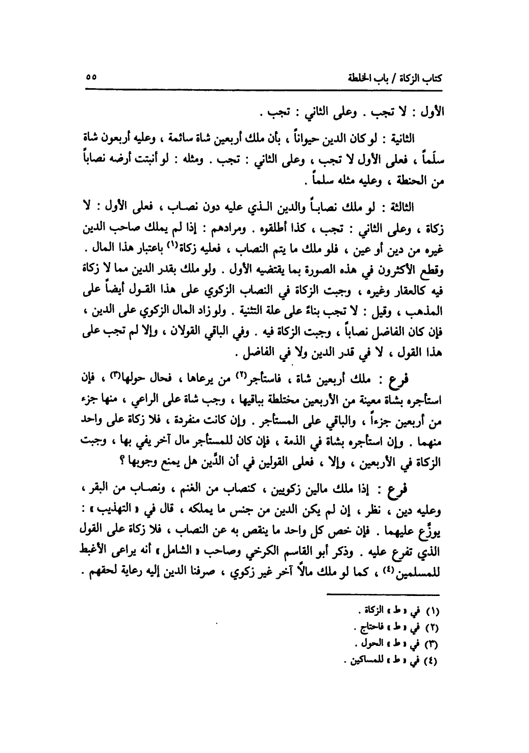 الاول: لا تجب. وعلى الثاني: تجب. الثانية: لو كان الدين حيوانا، بأن ملك أربعين شاة سائمة، وعليه أربعون شاة سلما، فعلى الاول لا تجب، وعلى الثاني: تجب. ومثله: لو أنبتت أرضه نصابا من الحنطة، وعليه مثله سلما. الثالثة: لو ملك نصابا والدين الذي عليه دون نصاب، فعلى الاول: لا زكاة، وعلى الثاني: تجب، كذا أطلقوه. ومرادهم: إذا لم يملك صاحب الدين غيره من دين أو عين، فلو ملك ما يتم النصاب، فعليه الزكاة باعتبار هذا المال. وقطع الاكثرون في هذه الصورة بما يقتضيه الاول. ولو ملك بقدر الدين مما لا زكاة فيه كالعقار وغيره، وجبت الزكاة في النصاب الزكوي على هذا القول أيضا على المذهب، وقيل: لا تجب بناء على علة التثنية. ولو زاد المال الزكوي على الدين، فإن كان الفاضل نصابا، وجبت الزكاة فيه. وفي الباقي القولان، وإلا لم تجب على هذا القول، لا في قدر الدين ولا في الفاضل. فرع ملك أربعين شاة، فاحتاج من يرعاها، فحال الحول، فإن استأجره بشاة معينة من الاربعين مختلطة بباقيها، وجب شاة على الراعي، منها جزء من أربعين جزءا، والباقي على المستأجر. وإن كانت منفردة، فلا زكاة على واحد منهما. وإن استأجره بشاة في الذمة، فإن كان للمستأجر مال آخر يفي بها، وجبت الزكاة في الاربعين، وإلا، فعلى القولين في أن الدين هل يمنع وجوبها ؟ فرع إذا ملك مالين زكويين، كنصاب من الغنم، ونصاب من البقر، وعليه دين، نظر، إن لم يكن الدين من جنس ما يملكه، قال في التهذيب: يوزع عليهما. فإن خص كل واحد ما ينقص به عن النصاب، فلا زكاة على القول الذي تفرع عليه. وذكر أبو القاسم الكرخي وصاحب الشامل أنه يراعى الاغبط للمساكين، كما لو ملك مالا آخر غير زكوي، صرفنا الدين إليه رعاية لحقهم.