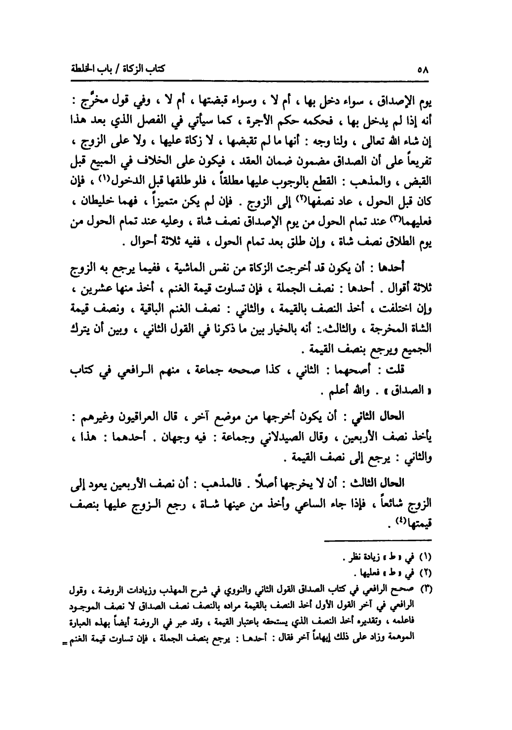 يوم الاصداق، سواء دخل بها، أم لا، وسواء قبضتها، أم لا، وفي قول مخرج: أنه إذا لم يدخل بها، فحكمه حكم الاجرة، كما سيأتي في الفصل الذي بعد هذا إن شاء الله تعالى، ولنا وجه: أنها ما لم تقبضها، لا زكاة عليها، ولا على الزوج، تفريعا على أن الصداق مضمون ضمان العقد، فيكون على الخلاف في المبيع قبل القبض، والمذهب: القطع بالوجوب عليها مطلقا، فلو طلقها قبل الدخول، نظر، فإن كان قبل الحول، عاد نصفها إلى الزوج. فإن لم يكن متميزا، فهما خليطان، فعليها عند تمام الحول من يوم الاصداق نصف شاة، وعليه عند تمام الحول من يوم الطلاق نصف شاة، وإن طلق بعد تمام الحول، ففيه ثلاثة أحوال. أحدها: أن يكون قد أخرجت الزكاة من نفس الماشية، ففيما يرجع به الزوج ثلاثة أقوال. أحدها: نصف الجملة، فإن تساوت قيمة الغنم، أخذ منها عشرين، وإن اختلفت، أخذ النصف بالقيمة، والثاني: نصف الغنم الباقية، ونصف قيمة الشاة المخرجة، والثالث: أنه بالخيار بين ما ذكرنا فق القول الثاني، وبين أن يترك الجميع ويرجع بنصف القيمة. قلت: أصحهما: الثاني، كذا صححه جماعة، منهم الرافعي في كتاب الصداق. والله أعلم. الحال الثاني: أن يكون أخرجها من موضع آخر، قال العراقيون وغيرهم: يأخذ نصف الاربعين، وقال الصيدلاني وجماعة: فيه وجهان. أحدهما: هذا، والثاني: يرجع إلى نصف القيمة. الحال الثالث: أن لا يخرجها أصلا. فالمذهب: أن نصف الاربعين يعود إلى الزوج شائعا، فإذا جاء الساعي وأخذ من عينها شاة، رجع الزوج عليها بنصف قيمتها.