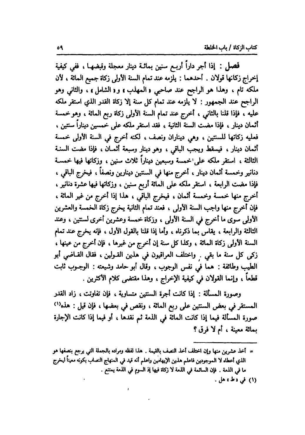 فصل إذا أجر دارا أربع سنين بمائة دينار معجلة وقبضها، ففي كيفية إخراج زكاتها قولان. أحدهما: يلزمه عند تمام السنة الاولى زكاة جميع المائة، لان ملكه تام، وهذا هو الراجح عند صاحبي المهذب والشامل، والثاني: وهو الراجح عند الجمهور: لا يلزمه عند تمام كل سنة إلا زكاة القدر الذي استقر ملكه عليه، فإذا قلنا بالثاني، أخرج عند تمام السنة الاولى زكاة ربع المائة، وهو خمسة أثمان دينار، فإذا مضت السنة الثانية، فقد استقر ملكه على خمسين دينارا سنتين، فعليه زكاتها للسنتين، وهي ديناران ونصف، لكنه أخرج في السنة الاولى خمسة أثمان دينار، فيسقط ويجب الباقي، وهو دينار وسبعة أثمان، فإذا مضت السنة الثالثة، استقر ملكه على خمسة وسبعين دينارا ثلاث سنين، وزكاتها فيها خمسة دنانير وخمسة أثمان دينار، أخرج منها في السنتين دينارين ونصفا، فيخرج الباقي، فإذا مضت الرابعة، استقر ملكه على المائة أربع سنين، وزكاتها فيها عشرة دنانير، أخرج منها خمسة وخمسة أثمان، فيخرج الباقي، هذا إذا أخرج من غير المائة، فإن أخرج منها واجب السنة الاولى، فعند تمام الثانية يخرج زكاة الخمسة والعشرين الاولى سوى ما أخرج في السنة الاولى، وزكاة خمسة وعشرين أخرى لسنتين، وعند الثالثة والرابعة، يقاس بما ذكرناه، وأما إذا قلنا بالقول الاول، فإنه يخرج عند تمام السنة الاولى زكاة المائة، وكذلك كل سنة إن أخرج من غيرها، فإن أخرج من عينها، زكى كل سنة ما بقي. واختلف العراقيون في هذين القولين، فقال القاضي أبو الطيب وطائفة: هما في نفس الوجوب، وقال أبو حامد وشيعته: الوجوب ثابت قطعا، وإنما القولان في كيفية الاخراج، وهذا مقتضى كلام الاكثرين. وصورة المسألة: إذا كانت أجرة السنتين متساوية، فإن تفاوتت، زاد القدر المستقر في بعض السنتين على ربع المائة، ونقص في بعضها، فإن قيل: هل صورة المسألة فيما إذا كانت المائة في الذمة ثم نقدها، أو فيما إذا كانت الاجارة بمائة معينة، أم لافرق ؟