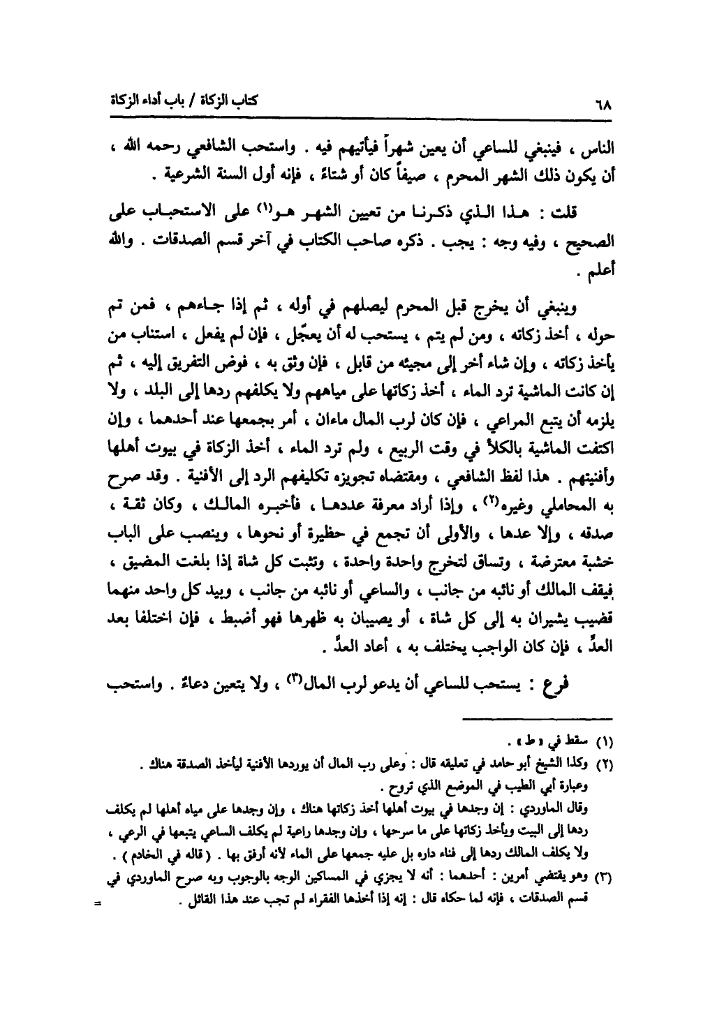 الناس، فينبغي للساعي أن يعين شهرا فيأتيهم فيه. واستحب الشافعي رحمه الله، أن يكون ذلك الشهر المحرم، صيفا كان أو شتاء، فإنه أول السنة الشرعية. قلت: هذا الذي ذكرنا من تعيين الشهر على الاستحباب على الصحيح، وفي وجه: يجب. ذكره صاحب الكتاب في آخر قسم الصدقات. والله أعلم. وينبغي أن يخرج قبل المحرم ليصلهم في أوله، ثم إذا جاءهم، فمن تم حوله، أخذ زكاته، ومن لم يتم، يستحب له أن يعجل، فإن لم يفعل، استناب من يأخذ زكاته، وإن شاء أخر إلى مجيئه من قابل، فإن وثق به، فوض التفريق إليه، ثم إن كانت الماشية ترد الماء، أخذ زكاتها على مياههم ولا يكلفهم ردها إلى البلد، ولا يلزمه أن يتبع المراعي، فإن كان لرب المال ماءان، أمر بجمعها عند أحدهما، وإن اكتفت الماشية بالكلا في وقت الربيع، ولم ترد الماء، أخذ الزكاة في بيوت أهلها وأفنيتهم. هذا لفظ الشافعي، ومقتضاه تجويز تكليفهم الرد إلى الافنية. وقد صرح به المحاملي وغيره، وإذا أراد معرفة عددها، فأخبره المالك، وكان ثقة، صدقه، وإلا عدها، والاولى أن تجمع في حظيرة أو نحوها، وينصب على الباب خشبة معترضة، وتساق لتخرج واحدة واحدة، وتثبت كل شاة إذا بلغت المضيق، فيقف المالك أو نائبه من جانب، والساعي أو نائبه من جانب، وبيد كل واحد منهما قضيب يشيران به إلى كل شاة، أو يصيبان به ظهرها فهو أضبط، فإن اختلفا بعد العد، فإن كان الواجب يختلف به، أعاد العد. فرع يستحب للساعي أن يدعو لرب المال، ولا يتعين دعاء. واستحب