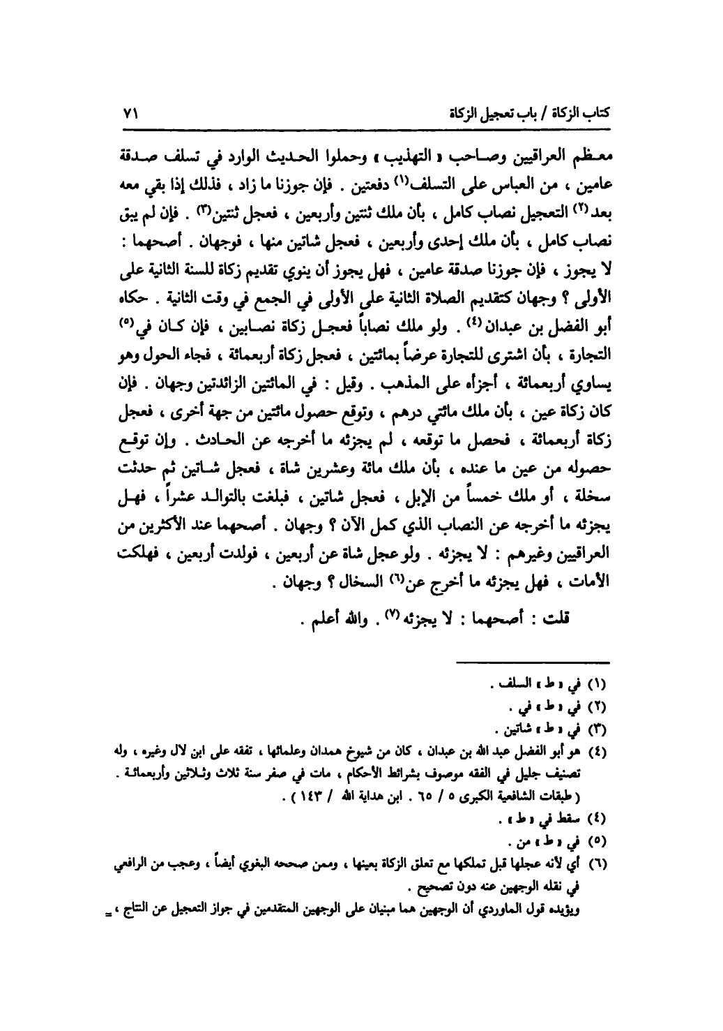 معظم العراقيين وصاحب التهذيب وحملوا الحديث الوارد في تسلف صدقة عامين، من العباس على التسلف دفعتين. فإن جوزنا ما زاد، فذلك إذا بقي معه في بعد التعجيل نصاب كامل، بأن ملك ثنتين وأربعين، فعجل شاتين. فإن لم يبق نصاب كامل، بأنملك إحدى وأربعين، فعجل شاتين منها، فوجهان. أصحهما: لا يجوز، فإن جوزنا صدقة عامين، فهل يجوز أن ينوي تقديم زكاة للسنة الثانية على الاولى ؟ وجهان كتقديم صلاة الثانية على الاولى في الجمع في وقت الثانية. حكاه أبو الفضل بن عبدان. ولو ملك نصابا. فعجل زكاة نصابين، فإن كان التجارة، بأن اشترى للتجارة عرضا بمائتين، فعجل زكاة أربعمائة، فجاء الحول وهو يساوي أربعمائة، أجزأه على المذهب. وقيل: في المائتين الزائدتين وجهان. فإن كان زكاة عين، بأن ملك مائتي درهم، وتوقع حصول مائتين من جهة أخرى، فعجل زكاة أربعمائة، فحصل ما توقعه، لم يجزئه ما أخرجه عن الحادث. وإن توقع حصوله من عين ما عنده، بأن ملك مائة وعشرين شاة، فعجل شاتين ثم حدثت سخلة، أو ملك خمسا من الابل، فعجل شاتين، فبلغت بالتوالد عشرا، فهل يجزئه ما أخرجه عن النصاب الذي كمل الآن ؟ وجهان. أصحهما عند الاكثرين من العراقيين وغيرهم: لا يجزئه. ولو عجل شاة عن أربعين، فولدت أربعين، فهلكت الامات، فهل يجزئه ما أخرج من السخال ؟ وجهان. قلت: أصحهما: لا يجزئه. والله أعلم.
