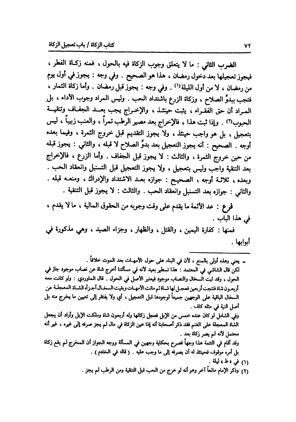 الضرب الثاني: ما لا يتعلق وجوب الزكاة فيه بالحول، فمنه زكاة الفطر، فيجوز تعجيلها بعد دخول رمضان، هذا هو الصحيح. وفي وجه: يجوز في أول يوم من رمضان، لا من أول ليلة. وفي وجه: يجوز قبل رمضان. وأما زكاة الثمار، فتجب ببدو الصلاح، وزكاة الزرع باشتداد الحب. وليس المراد وجوب الاداء، بل المراد أن حق الفقراء، يثبت حينئذ، والاخراج يجب بعد الجفاف وتنقية الحبوب. وإذا ثبت هذا، فالاخراج بعد مصير الرطب تمرا، والعنب زبيبا، ليس بتعجيل، بل هو واجب حينئذ، ولا يجوز التقديم قبل خروج الثمرة، وفيما بعده أوجه. الصحيح: أنه يجوز التعجيل بعد بدو الصلاح لا قبله، والثاني: يجوز قبله من حين خروج الثمرة، والثالث: لا يجوز قبل الجفاف. وأما الزروع، فالاخراج بعد التنقية واجب وليس بتعجيل، ولا يجوز التعجيل قبل التسنبل وانعقاد الحب. وبعده، ثلاثة أوجه، الصحيح: جوازه بعد الاشتداد والادراك، ومنعه قبله. والثاني: جوازه بعد التسنبل وانعقاد الحب. والثالث: لا يجوز قبل التنقية. فرع عد الائمة ما يقدم على وقت وجوبه من الحقوق المالية، وما لا يقدم، في هذا الباب. فمنها: كفارة اليمين، والقتل، والظهار، وجزاء الصيد، وهي مذكورة في أبوابها.
