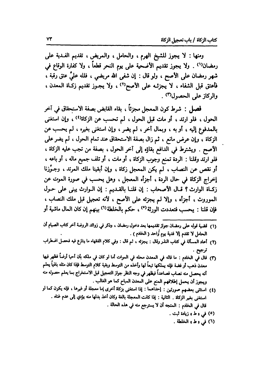 ومنها: لا يجوز للشيخ الهرم، والحامل، والمريض، تقديم الفدية على رمضان. ولا يجوز تقديم الاضحية على يوم النحر قطعا، ولا كفارة الوقاع في شهر رمضان على الاصح، ولو قال: إن شفى الله مريضي، فلله علي عتق رقبة، فأعتق قبل الشفاء، لا يجزئه على الاصح، ولا يجوز تقديم زكاة المعدن، والركاز على الحصول. فصل شرط كون المعجل مجزئا، بقاء القابض بصفة الاستحقاق في آخر الحول، فلو ارتد، أو مات قبل الحول، لم تحسب عن الزكاة، وإن استغنى بالمدفوع إليه، أو به، وبمال آخر، لم يضر، وإن استغنى بغيره، لم يحسب عن الزكاة، وإن عرض مانع، ثم زال وصار برفة الاستحقاق عند تمام الحول، لم يضر على الاصح. ويشترط في الدافع بقاؤه إلى آخر الحول، بصفة من تجب عليه الزكاة، فلو ارتد وقلنا: الردة تمنع وجوب الزكاة، أو مات، أو تلف جميع ماله، أو باعه، أو نقص عن النصاب، لم يكن المعجل زكاة، وإن أبقينا ملك المرتد، وجوزنا إخراج الزكاة في حال الردة، أجزأه المعجل، وهل يحسب في صورة الموت عن زكاة الوارث ؟ قال الاصحاب: إن قلنا بالقديم: إن الوارث يبنى على حول الموروث، أجزأه، وإلا لم يجزئه على الاصح، لانه تعجيل قبل ملك النصاب، فإن قلنا: يحسب فتعددت الورثة، ثبت حكم الخلطة بينهم إن كان المال ماشية أو