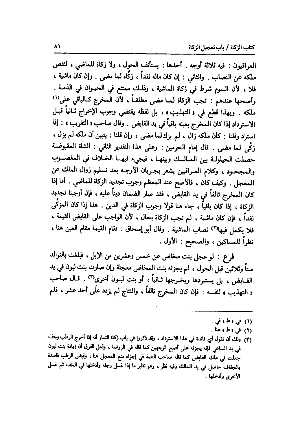العراقيون: فيه ثلاثة أوجه. أحدها: يستأنف الحول، ولا زكاة للماضي، لنقص ملكه عن النصاب. والثاني: إن كان ماله نقدا، زكاه لما مضى. وإن كان ماشية، فلا، لان السوم شرط في زكاة الماشية، وذلك ممتنع في الحيوان في الذمة. وأصحها عندهم: تجب الزكاة لما مضى مطلقا، لان المخرج كالباقي في ملكه. وبهذا قطع في التهذيب، بل لفظه يقتضي وجوب الاخراج ثانيا قبل الاسترداد إذا كان المخرج بعينه باقيا في يد القابض. وقال صاحب التقريب: إذا استرد وقلنا: كأن ملكه زال، لم يزك لما مضى، وإن قلنا: يتبين أن ملكه لم يزل، زكى لما مضى. قال إمام الحرمين: وعلى هذا التقدير الثاني: الشاة المقبوضة حصلت الحيلولة بين المالك وبينها، فيجئ فيها الخلاف في المغصوب والمجحود. وكلام العراقيين يشعر بجريان الاوجه بعد تسليم زوال الملك عن المعجل. وكيف كان، فالاصح عند المعظم وجوب تجديد الزكاة للماضي. أما إذا كان المخرج تالفا في يد القابض، فقد صار الضمان دينا عليه، فإن أوجبنا تجديد الزكاة، إذا كان باقيا، جاء هنا قولا وجوب الزكاة في الدين. هذا إذا كان المزكى نقدا، فإن كان ماشية، لم تجب الزكاة بحال، لان الواجب على القابض القيمة، فلا يكمل هنا نصاب الماشية. وقال أبو إسحق: تقام القيمة مقام العين هنا، نظرا للمساكين، والصحيح: الاول. فرع لو عجل بنت مخاض عن خمس وعشرين من الابل، فبلغت بالتوالد ستا وثلاثين قبل الحول، لم يجزئه بنت المخاض معجلة وإن صارت بنت لبون في يد القابض، بل يستردها ويخرجها ثانيا، أو بنت لبون أخرى. قال صاحب التهذيب لنفسه: فإن كان المخرج تالفا، والنتاج لم يزد على أحد عشر، فلم