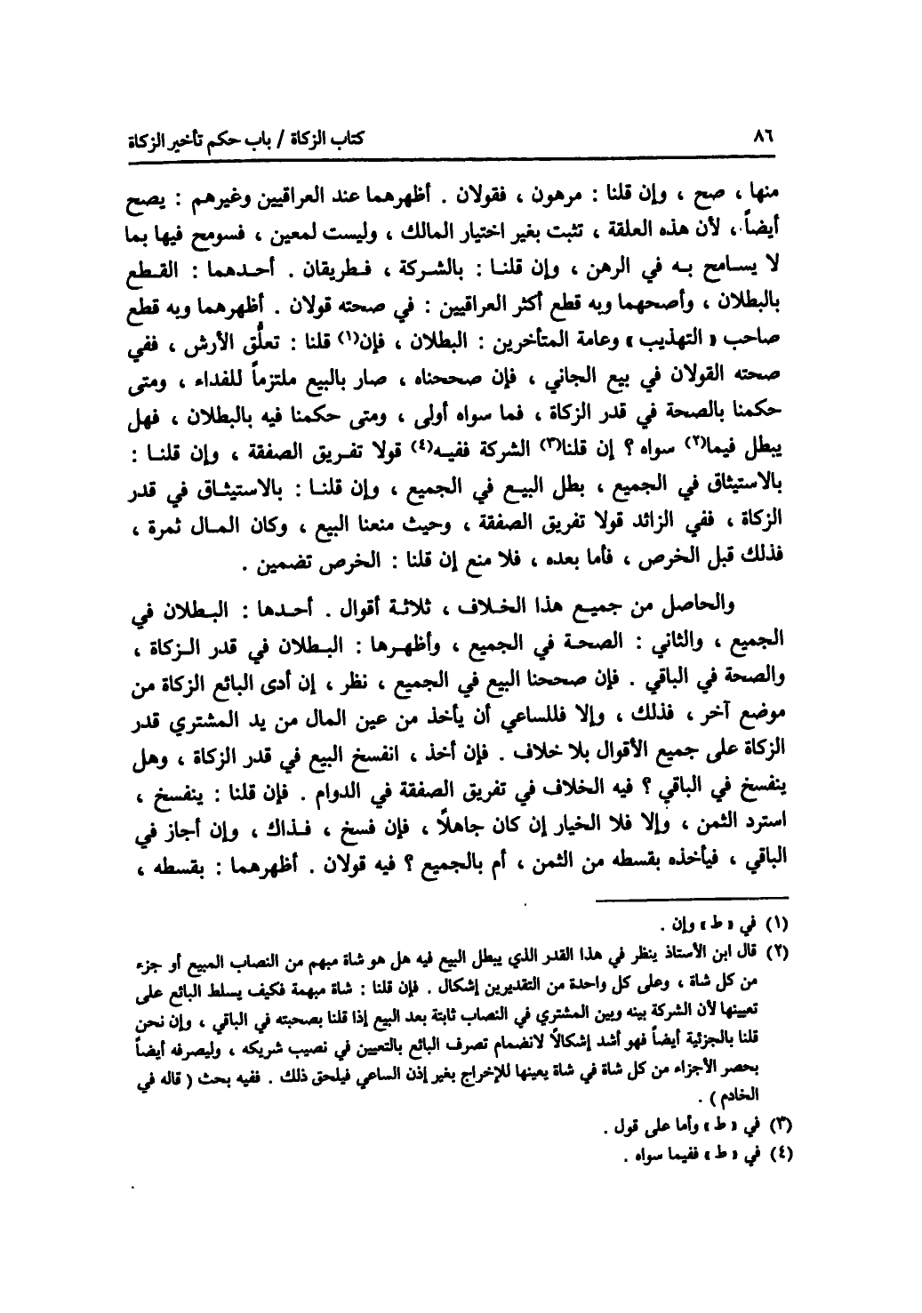 منها، صح، وإن قلنا: مرهون، فقولان. أظهرهما عند العراقيين وغيرهم: يصح أيضا، لان هذه العلقة، تثبت بغير اختيار المالك، وليست لمعين، فسومح فيهد بما لا يسامح به في الرهن، وإن قلنا: بالشركة، فطريقان. أحدهما: القطع بالبطلان، وأصحهما وبه قطع أكثر العراقيين: في صحته قولان. أظهرهما وبه قطع صاحب التهذيب وعامة المتأخرين: البطلان، وإن قلنا: تعلق الارش، ففي صحته القولان في بيع الجاني، فإن صححناه، صار البيع ملتزما للفداء، ومتى حكمنا بالصحة في قدر الزكاة، فما سواه أولى، ومتى حكمنا فيه بالبطلان، فهل يبطل فيما سواه ؟ وأما على قول الشركة ففيما سواه قولا تفريق الصفقة، وإن قلنا: بالاستيثاق في الجميع، بطل البيع في الجميع، وإن قلنا: بالاستيثاق في قدر الزكاة، ففي الزائد قولا تفريق الصفقة، وحيث منعنا البيع، وكان المال ثمرة، فذلك قبل الخرص، فأما بعده، فلا منع إن قلنا: الخرص تضمين. والحاصل من جميع هذا الخلاف، ثلاثة أقوال. أحدها: البطلان في الجميع، والثاني: الصحة في الجميع، وأظهرها: البطلان في قدر الزكاة، والصحة في الباقي. فإن صححنا البيع في الجميع، نظر، إن أدى البائع الزكاة من موضع آخر، فذلك، وإلا فللساعي أن يأخذ من عين المال من يد المشتري قدر الزكاة على جميع الاقوال بلا خلاف. فإن أخذ، انفسخ البيع في قدر الزكاة، وهل ينفسخ في الباقي ؟ فيه الخلاف في تفريق الصفقة في الدوام. فإن قلنا: ينفسخ، استرد الثمن، وإلا فله الخيار إن كان جاهلا، فإن فسخ، فذاك، وإن أجاز في الباقي، فيأخذه بقسطه من الثمن، أم بالجميع ؟ فيه قولان. أظهرهما: بقسطه،