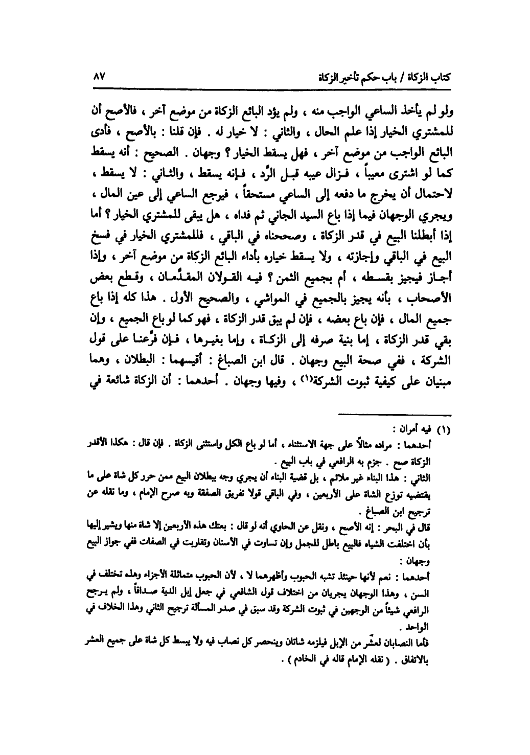 ولو لم يأخذ الساعي الواجب منه، ولم يؤد البائع الزكاة من موضع آخر، فالاصح أن للمشتري الخيار إذا علم الحال، والثاني: لا خيار له. فإن قلنا: بالاصح، فأدى البائع الواجب من موضع آخر، فهل يسقط الخيار ؟ وجهان. الصحيح: أنه يسقط كما لو اشترى معيبا، فزال عيبه قبل الرد، فإنه يسقط، والثاني: لا يسقط، لاحتمال أن يخرج ما دفعه إلى دلساعي مستحقا، فيرجع الساعي إلى عين المال، ويجري الوجهان فيما إذا باع السيد الجاني ثم فداه، هل يبقى للمشتري الخيار ؟ أما إذا أبطلنا البيع في قدر الزكاة، وصححناه في الباقي، فللمشتري الخيار في فسخ البيع في الباقي وإجازته، ولا يسقط خياره بأداء البائع الزكاة من موضع آخر، وإذ أجاز فيجيز بقسطه، أم بجميع الثمن ؟ فيه القولان المقدمان، وقطع بعض الاصحاب، بأنه يجيز بالجميع في المواشي، والصحيح الاول. هذا كله إذا باع جميع المال، فإن باع بعضه، فإن لم يبق قدر الزكاة، فهو كما لو باع الجميع، وإن بقي قدر الزكاة، إما بنية صرفه إلى الزكاة، وإما بغيرها، فإن فرعنا على قول الشركة، ففي صحة البيع وجهان. قال ابن الصباغ: أقيسهما: البطلان، وهما مبنيان على كيفية ثبوت الشركة، وفيها وجهان. أحدهما: أن الزكاة شائعة في