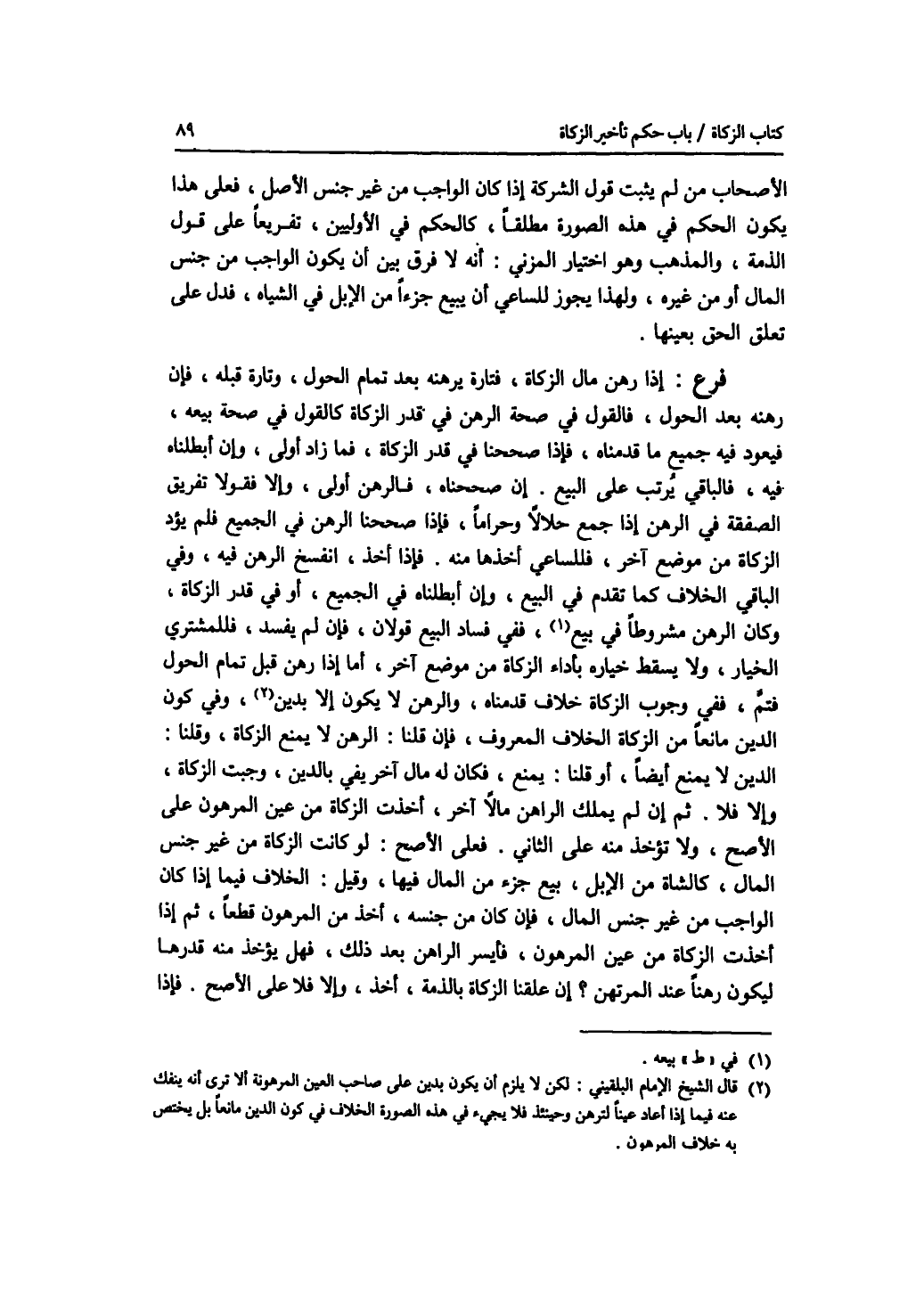 الاصحاب من لم يثبت قول الشركة إذا كان الواجب من غير جنس الاصل، فعلى هذا يكون الحكم في هذه الصورة مطلقا، كالحكم في الاوليين، تفريعا على قول الذمة، والمذهب وهو اختيار المزني: أنه لا فرق بين أن يكون الواجب من جنس المال أو من غيره، ولهذا يجوز للساعي أن يبيع جزءا من الابل في الشياه، فدل على تعلق الحق بعينها. فرع إذا رهن مال الزكاة، فتارة يرهنه بعد تمام الحول، وتارة قبله، فإن رهنه بعد الحول، فالقول في صحة الرهن في قدر الزكاة كالقول في صحة بيعه، فيعود فيه جميع ما قدمناه، فإذا صححنا في قدر الزكاة، فما زاد أولى، وإن أبطلناه فيه، فالباقي يرتب على البيع. إن صححناه، فالرهن أولى، وإلا فقولا تفريق الصفقة في الرهن إذا جمع حلالا وحراما، فإذا صححنا الرهن في الجميع فلم يؤد الزكاة من موضع آخر، فللساعي أخذها منه. فإذا أخذ، انفسخ الرهن فيه، وفي الباقي الخلاف كما تقدم في البيع، وإذا أبطلناه في الجميع، أو في قدر الزكاة، وكان الرهن مشروطا في بيعه، ففي فساد البيع قولان، فإن لم يفسد، فللمشتري الخيار، ولا يسقط خياره بأداء الزكاة من موضع آخر، أما إذا رهن قبل تمام الحول فتم، ففي وجوب الزكاة خلاف قدمناه، والرهن لا يكون إلا بدين، وفي كون الدين مانعا من الزكاة الخلاف المعروف، فإن قلنا: الرهن لا يمنع الزكاة، وقلنا: الدين لا يمنع أيضا، أو قلنا: يمنع، فكان له مال آخر يفي بالدين، وجبت الزكاة، وإلا فلا. ثم إن لم يملك الراهن مالا آخر، أخذت الزكاة من عين المرهون على الاصح، ولا تؤخذ منه على الثاني. فعلى الاصح: لو كانت الزكاة من غير جنس المال، كالشاة من الابل، بيع جزء من المال فيها، وقيل: الخلاف فيما إذا كان الواجب من غير جنس المال، فإن كان من جنسه، أخذ من المرهون قطعا، ثم إذا أخذت الزكاة من عين المرهون، فأيسر الراهن بعد ذلك، فهل يؤخذ منه قدرها ليكون رهنا عند المرتهن ؟ إن علقنا الزكاة بالذمة، أخذ، وإلا فلا على الاصح. فإذا