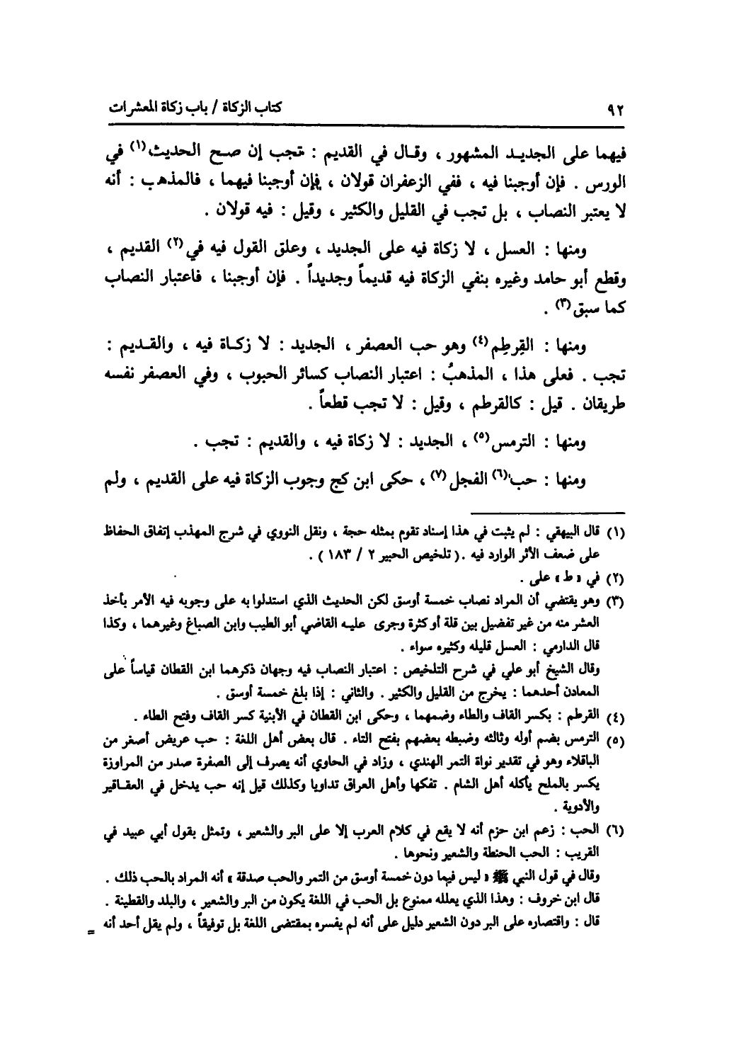 فيهما على الجديد المشهور، وقال في القديم: تجب إن صح الحديث في الورس. فإن أوجبنا فيه، ففي الزعفران قولان، فإن أوجبنا فيهما، فالمذهب: أنه لا يعتبر النصاب، بل تجب في القليل والكثير، وقيل: فيه قولان. ومنها: العسل، لا زكاة فيه على الجديد، وعلق القول فيه على القديم، وقطع أبو حامد وغيره بنفي الزكاة فيه قديما وجديدا. فإن أوجبنا، فاعتبار النصاب كما سبق. ومنها: القرطم وهو حب العصفر، الجديد: لا زكاة فيه، والقديم: تجب. فعلى هذا، المذهب: اعتبار النصاب كسائر الحبوب، وفي العصفر نفسه طريقان. قيل: كالقرطم، وقيل: لا تجب قطعا. ومنها: الترمس، الجديد: لا زكاة فيه، والقديم: تجب. ومنها: حب الفجل، حكى ابن كج وجوب الزكاة فيه على القديم، ولم