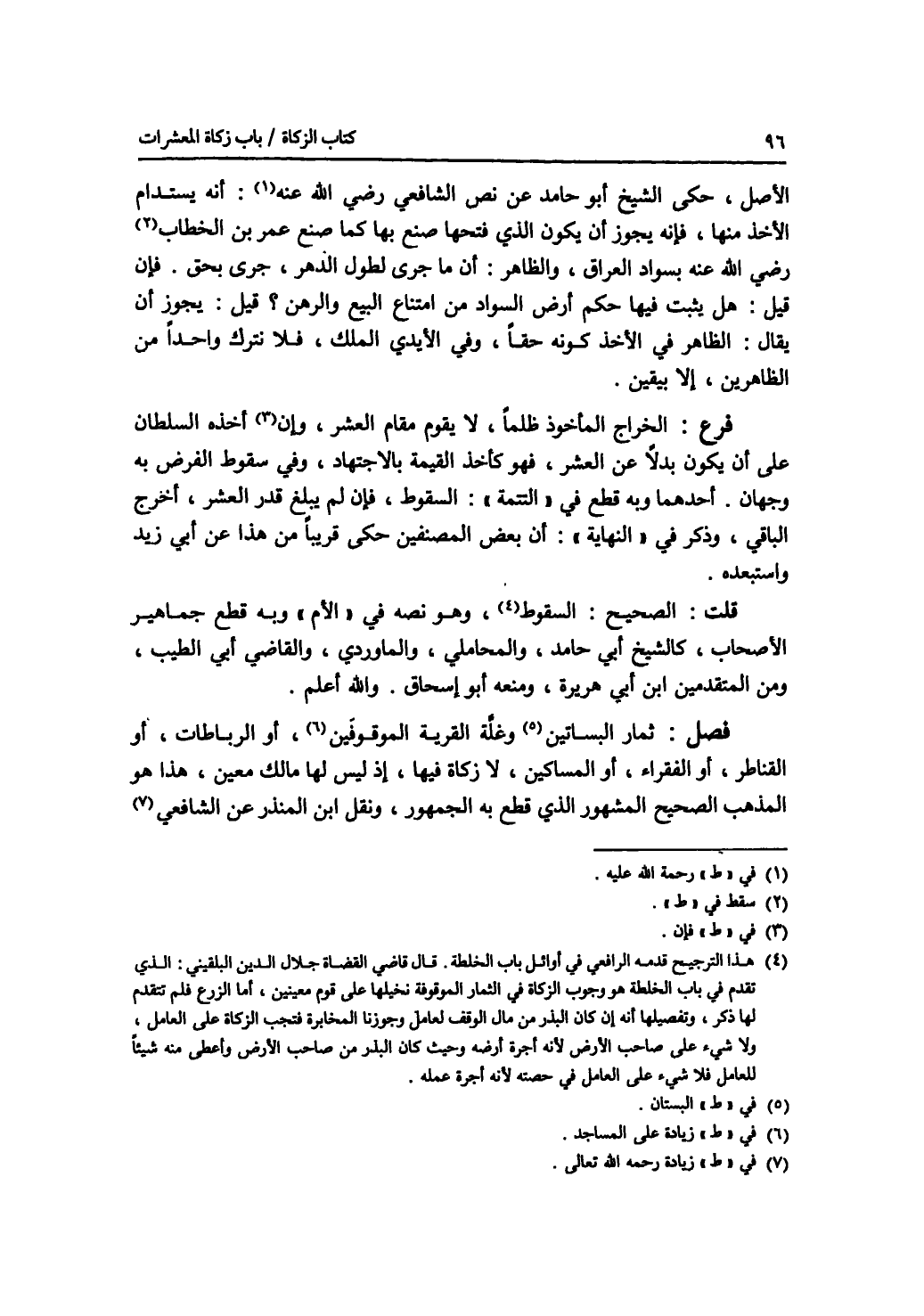 الاصل، حكى الشيخ أبو حامد عن نص الشافعي رحمة الله عليه: أنه يستدام الاخذ منها، فانه يجوز أن يكون الذي فتحها صنع بها كما صنع عمر رضي الله عنه بسواد العراق، والظاهر: أن ما جرى لطول الدهر، جرى بحق. فإن قيل: هل يثبت فيها حكم أرض السواد من امتناع البيع والرهن ؟ قيل: يجوز أن يقال: الظاهر في الاخذ كونه حقا، وفي الايدي الملك، فلا نترك واحدا من الظاهرين، إلا بيقين. فرع الخراج المأخوذ ظلما، لا يقوم مقام العشر، فإن أخذه السلطان على أن يكون بدلا عن العشر، فهو كأخذ القيمة بالاجتهاد، وفي سقوط الفرض به وجهان. أحدهما وبه قطع في التتمة: السقوط، فإن لم يبلغ قدر العشر، أخرج الباقي، وذكر في النهاية: أن بعض المصنفين حكى قريبا من هذا عن أبي زيد واستبعده. قلت: الصحيح: السقوط، ونو نصه في الام وبه قطع جماهير الاصحاب، كالشيخ أبي حامد، والمحاملي، والماوردي، والقاضي أبي الطيب، ومن المتقدمين ابن أبي هريرة، ومنعه أبو إسحق. والله أعلم. فصل ثمار البستان وغلة القرية الموقوفين على المساجد، أو الرباطات، أو القناطر، أو الفقراء، أو المساكين، لا زكاة فيها، إذ ليس لها مالك معين، هذا هو المذهب الصحيح المشهور الذي قطع به الجمهور، ونقل ابن المنذر عن الشافعي رحمه الله تعالى