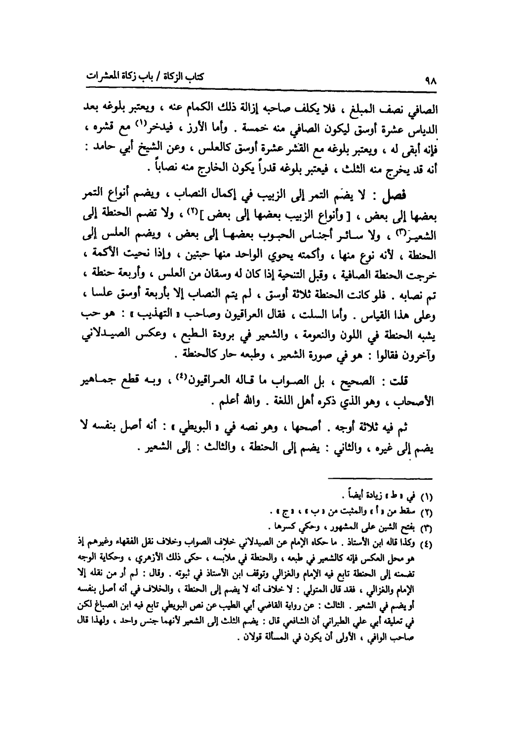 الصافي نصف المبلغ، فلا يكلف صاحبه إزالة ذلك الكمام عنه، ويعتبر بلوغه بعد الدياس عشرة أوسق ليكون الصافي منه خمسة. وأما الارز، فيدخر أيضا مع قشره، فإنه أبقى له، ويعتبر بلوغه مع القشر عشرة أوسق كالعلس، وعن الشيخ أبي حامد: أنه قد يخرج منه الثلث، فيعتبر بلوغه قدرا يكون الخارج منه نصابا. فصل لا يضم التمر إلى الزبيب في إكمال النصاب، ويضم أنواع التمر بعضها إلى بعض، وأنواع الزبيب بعضها إلى بعض، ولا تضم الحنطة إلى الشعير، ولا سائر أجناس الحبوب بعضها إلى بعض، ويضم العلس إلى الحنطة، لانه نوع منها، وأكمته يحوي الواحد منها حبتين، وإذا نحيت الاكمة، خرجت الحنطة الصافية، وقبل التنحية إذا كان له وسقان من العلس، وأربعة حنطة، تم نصابه. فلو كانت الحنطة ثلاثة أوسق، لم يتم النصاب إلا بأربعة أوسق علسا، وعلى هذا القياس. وأما السلت، فقال العراقيون وصاحب التهذيب: هو حب يشبه الحنطة في اللون والنعومة، والشعير في برودة الطبع، وعكس الصيدلاني وآخرون فقالوا: هو في صورة الشعير، وطبعه حار كالحنطة. قلت: الصحيح، بل الصواب ما قاله العراقيون، وبه قطع جماهير الاصحاب، وهو الذي ذكره أهل اللغة. والله أعلم. ثم فيه ثلاثة أوجه. أصحها، وهو نصه في البويطي: أنه أصل بنفسه لا يضم إلى غيره، والثاني: يضم إلى الحنطة، والثالث: إلى الشعير.
