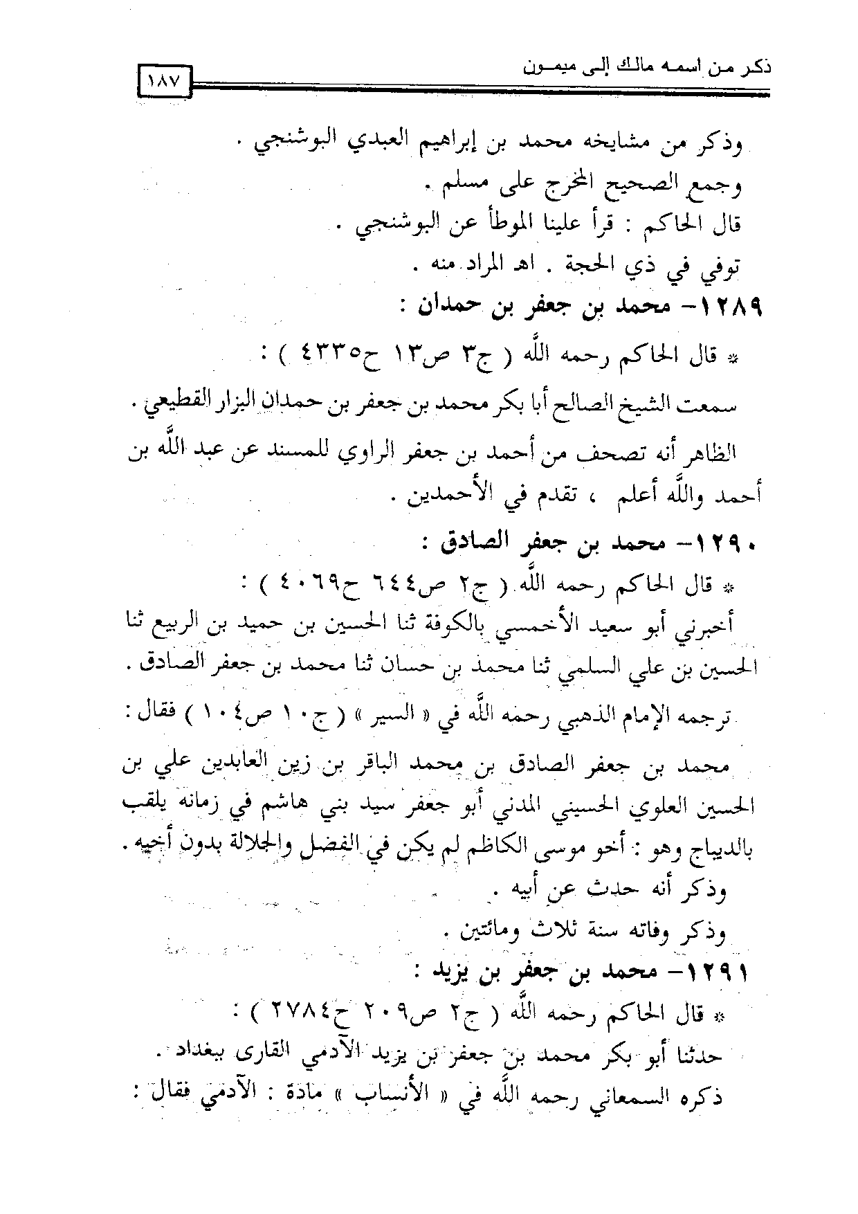 ترجمه الإمام الذهبي رحمه الله في «السير» (ج 10 ص 104) فقال: محمد بن جعفر الصادق بن محمد الباقر بن زين العابدين علي بن الحسين العلوي الحسيني المدني أبو جعفر سيد بني هاشم في زمانه يلقب بالديباج وهو: أخو موسى الكاظم لم يكن في الفضل والجلالة بدون أخيه وذكر أنه حدث عن أبيه.