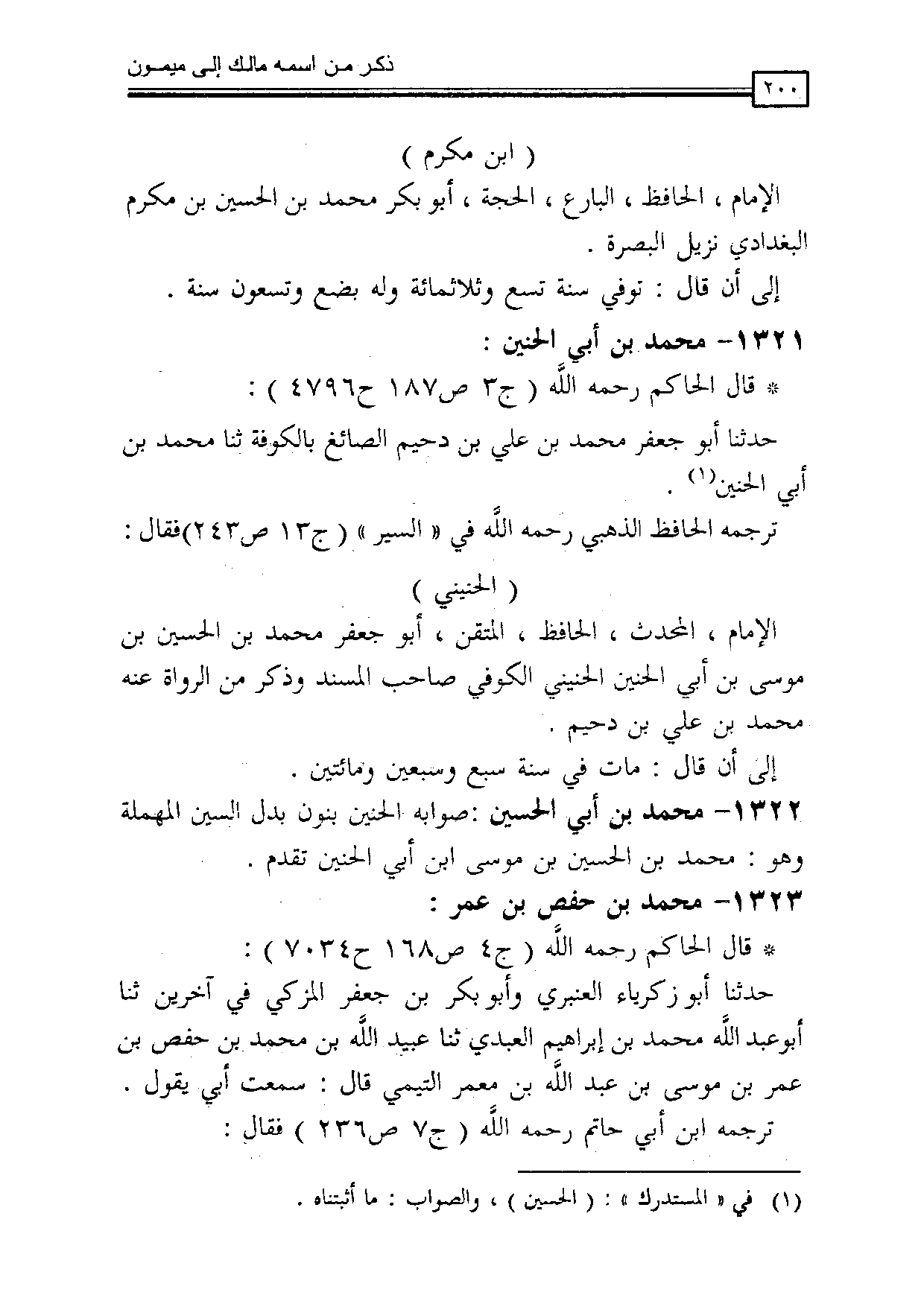 1322 - محمد بن أبي الحسين: صوابه الحنين بنون بدل السين المهملة وهو: محمد بن الحسين بن موسى +ابن أبي الحنين تقدم.