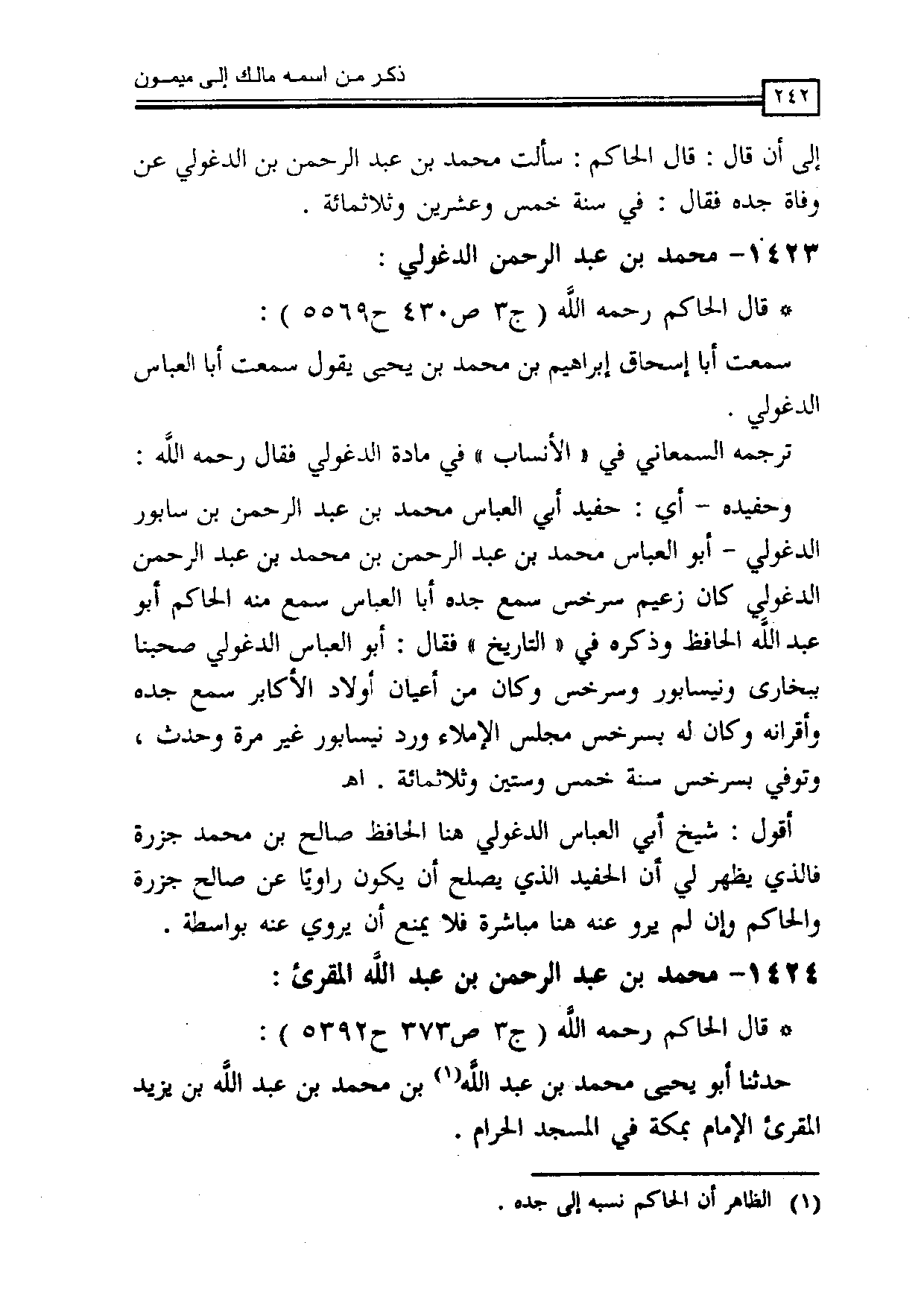 وحفيده أي حفيد أبي العباس محمد بن عبد الرحمن بن سابور الدغولي أبو العباس محمد بن عبد الرحمن بن محمد بن عبد الرحمن الدغولي كان زعيم سرخس سمع جده أبا العباس سمع منه الحاكم أبو عبد الله الحافظ وذكره في «التاريخ» فقال: أبو العباس الدغولي صحبنا ببخارى ونيسابور وسرخس، وكان من أعيان أولاد الأكابر سمع جده وأقرانه، وكان له بسرخس مجلس الإملاء ورد نيسابور غير مرة وحدث وتوفي بسرخس سنة خمس وستين وثلاثمائة. ا هـ