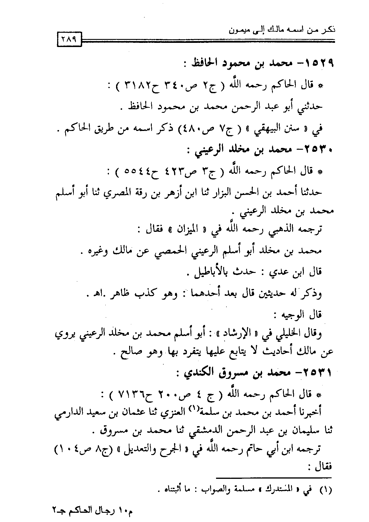 وقال الخليلي في «الإرشاد»: أبو أسلم محمد بن مخلد الرعيني يروي عن مالك أحاديث لا يتابع عليها يتفرد بها، وهو صالح.