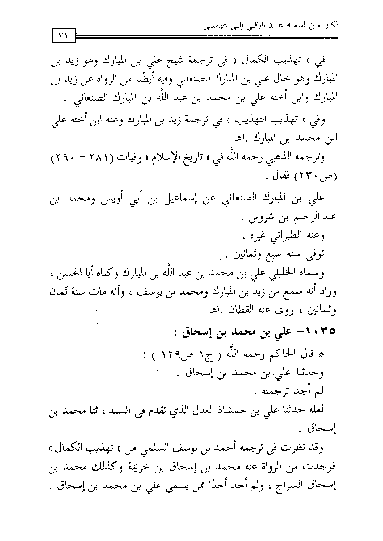 في "تهذيب الكمال" في ترجمة شيخ علي بن المبارك وهو زيد بن المبارك وهو خال علي بن المبارك الصنعاني، وفيه أيضا من الرواة، عن زيد بن المبارك وابن أخته علي بن محمد بن عبد الله بن المبارك الصنعاني.