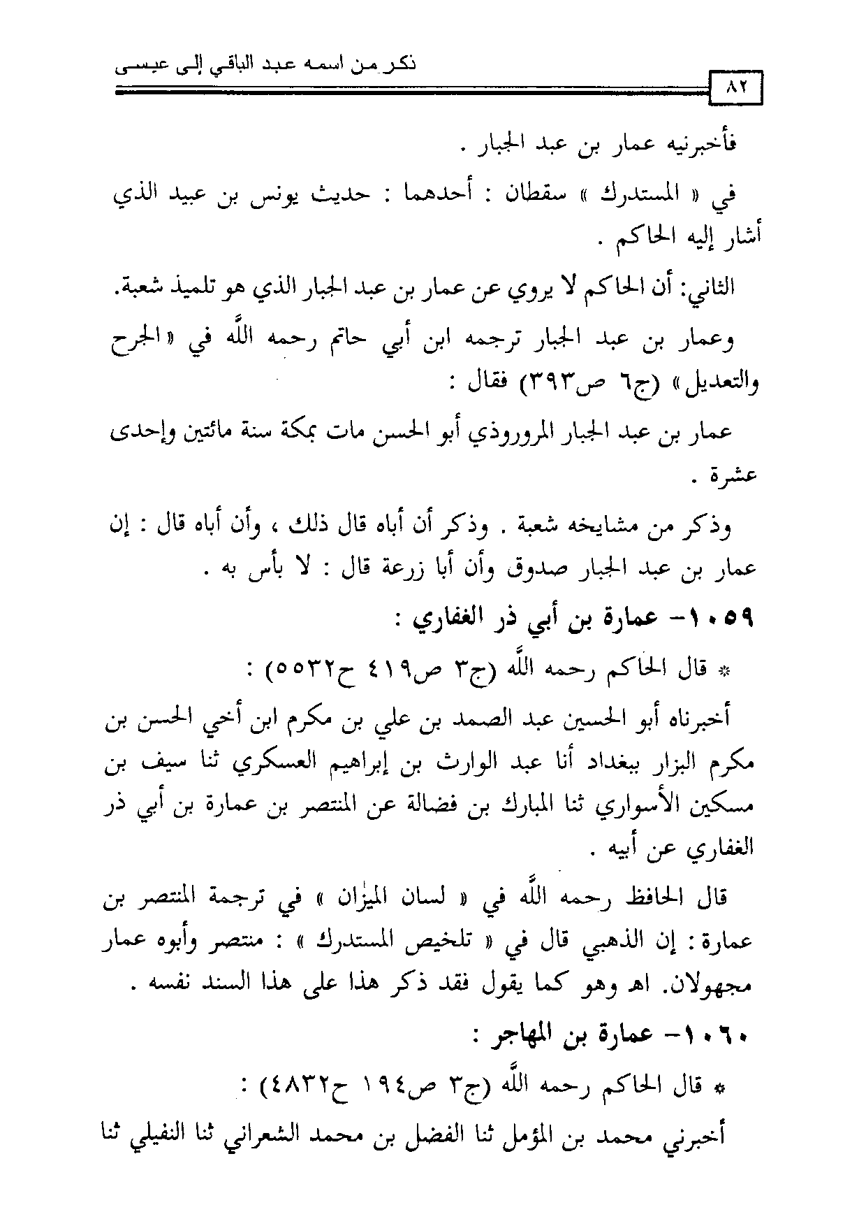 الثاني: أن الحاكم لا يروي عن عمار بن عبد الجبار الذي هو تلميذ شعبة. وعمار بن عبد الجبار ترجمه ابن أبي حاتم رحمه الله في «الجرح والتعديل» (ج 6 ص 393) فقال: