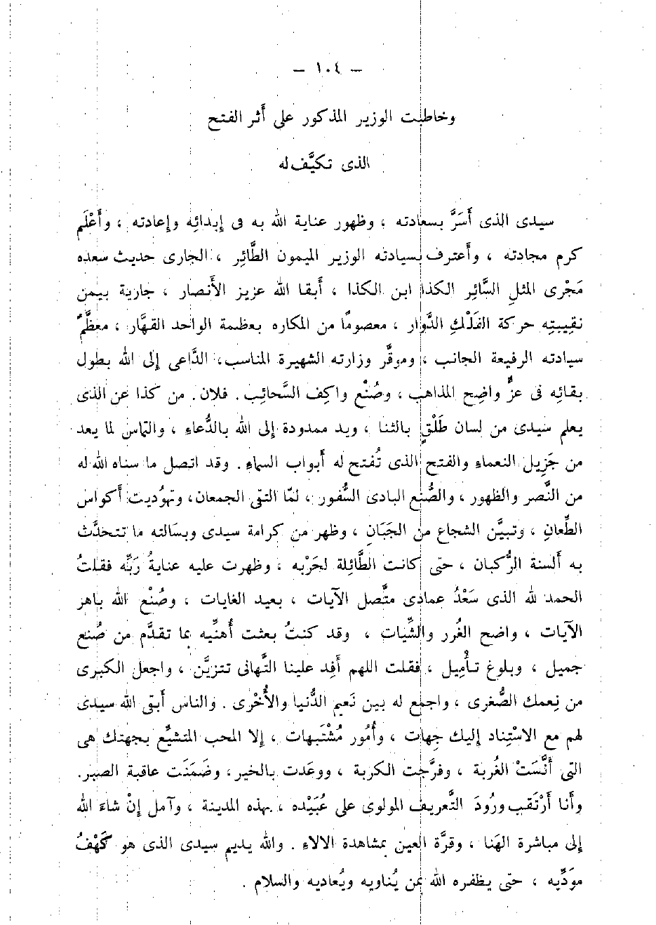 سَيِّدي الذ أسر بسعادته، وَظُهُور عناية الله بِهِ فِي إبدائه وإعادته، وَأعلم كرم مجادته، وأعترف بسيادته الْوَزير الميمون الطَّائِر، الْجَارِي حَدِيث سعده مجري الْمثل السائر الكذا ابْن الكذا، أبقا الله عَزِيز الْأَنْصَار، جَارِيَة بيمن نقيبته حَرَكَة الْفلك الدوار، مَعْصُوما من المكاره بعظمة الْوَاحِد القهار، مُعظم سيادته الرفيعة الْجَانِب، وموقر وزارته الشهيرة الْمُنَاسب، الدَّاعِي إِلَى الله بطول بَقَائِهِ فِي عز وَاضح الْمذَاهب، وصنع واكف السحائب. فلَان. من كَذَا عَن الَّذِي يعلم سَيِّدي من لِسَان طلق بالثنا، وَيَد ممدودة إِلَى الله بِالدُّعَاءِ، والتماس لما يعد من جزيل النعماء وَالْفَتْح الَّذِي تفتح لَهُ أَبْوَاب السَّمَاء. وَقد اتَّصل مَا سناه الله لَهُ من النَّصْر والظهور، والصنع البادي السفور، لما التقى الْجَمْعَانِ، وتهوديت أكواس الطعان، وَتبين الشجاع من الجبان، وَظهر من كَرَامَة سَيِّدي وبسالته مَا تَتَحَدَّث بِهِ أَلْسِنَة الركْبَان، حَتَّى كَانَت الطائلة لحربه، وَظَهَرت عَلَيْهِ عناية ربه فَقلت الْحَمد لله الَّذِي سعد عمادي مُتَّصِل الْآيَات، بعيد الغايات، وصنع الله باهر الْآيَات، وَاضح الْغرَر والشيات، وَقد كنت بعثت أهنيه بِمَا تقدم من صنع جميل، وبلوغ تأميل، فَقلت اللَّهُمَّ أفد علينا التهاني تتزين، وَاجعَل الْكُبْرَى من نعمك الصُّغْرَى، واجمع لَهُ بَين نعيم الدُّنْيَا وَالْأُخْرَى. وَالنَّاس أبقى الله سَيِّدي لَهُم مَعَ الِاسْتِنَاد إِلَيْك جِهَات، وَأُمُور مُشْتَبهَات، إِلَّا الْمُحب المتشيع بجهتك هِيَ الَّتِي أنست الغربة، وفرجت الْكُرْبَة، ووعدت بِالْخَيرِ، وضمنت عَاقِبَة الصَّبْر. وَأَنا أرتقب وُرُود التَّعْرِيف المولوى على عبيده، بِهَذِهِ الْمَدِينَة، وآمل إِن شَاءَ الله إِلَى مُبَاشرَة الهنا، وقرة الْعين بمشاهدة الالاء. وَالله يديم سَيِّدي الَّذِي هُوَ كَهْف موديه، حَتَّى يطفره الله بِمن يناويه ويعاديه وَالسَّلَام.