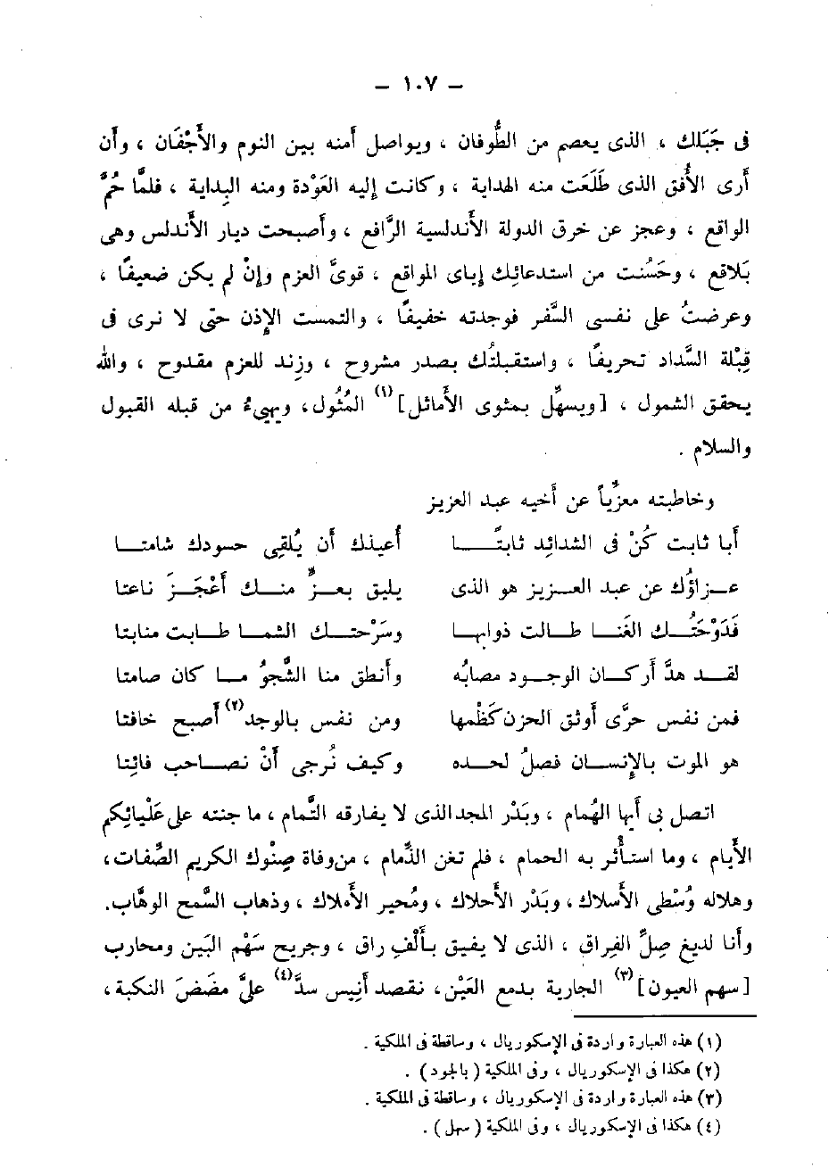 اتَّصل بِي أَيهَا الْهمام، وَبدر الْمجد الَّذِي لَا يُفَارِقهُ التَّمام، مَا جنته على عليائكم الْأَيَّام، وَمَا اسْتَأْثر بِهِ الْحمام، فَلم تغن الذمام، من وَفَاة صنوك الْكَرِيم الصِّفَات، وهلاله وسطى الأسلاك، وَبدر الأحلاك، ومحير الْأَمْلَاك، وَذَهَاب السَّمْح الْوَهَّاب. وَأَنا لديغ صل الْفِرَاق، الَّذِي لَا يفِيق بِأَلف راق، وجريح سهم الْبَين ومحارب [سهم الْعُيُون] الْجَارِيَة بدمع الْعين، نقصد أنيس سد على مضض النكبة،