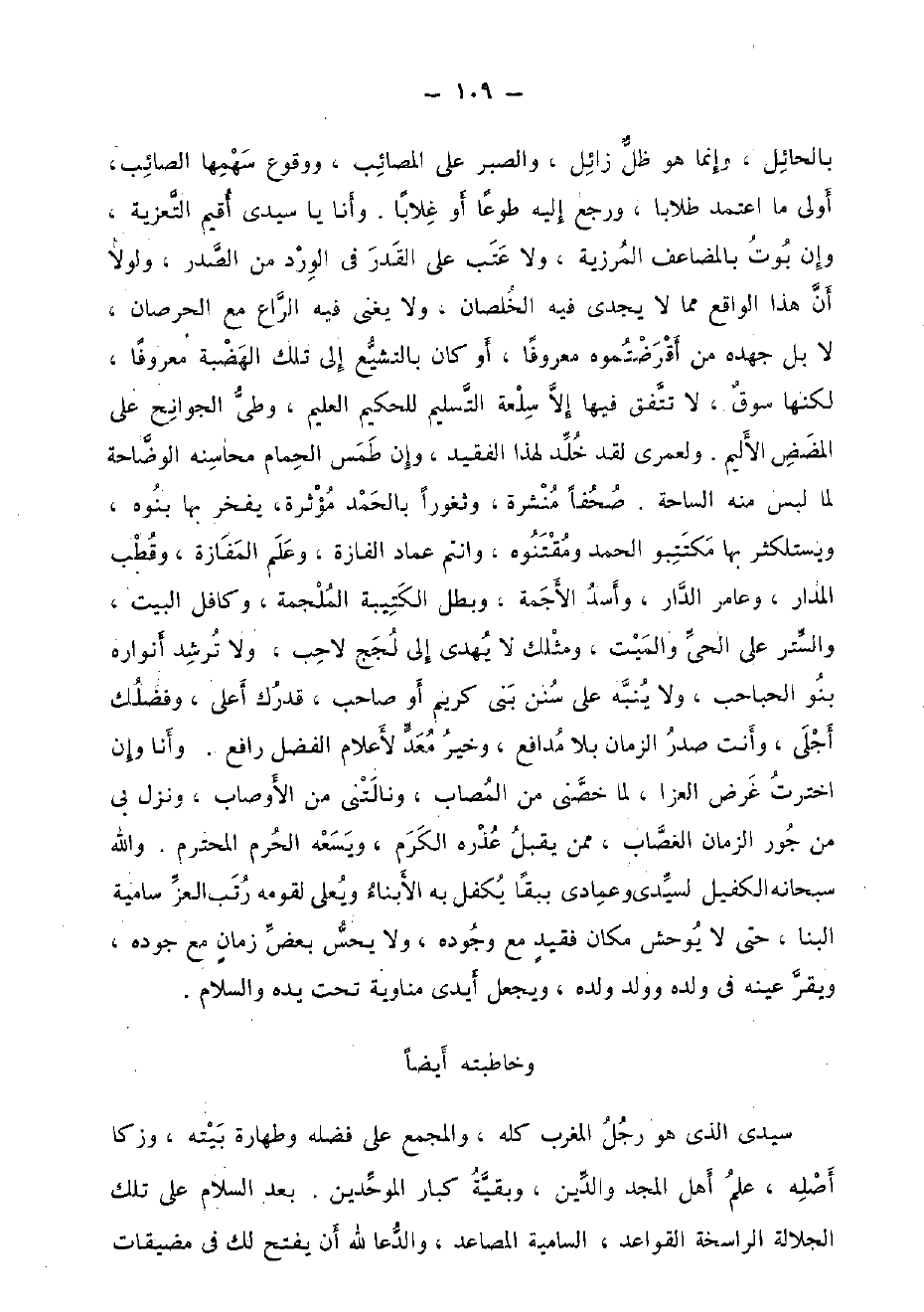 وخاطبته أَيْضا سَيِّدي الَّذِي هُوَ رجل الْمغرب كُله، وَالْمجْمَع على فَضله وطهارة بَيته، وزكا أَصله، علم أهل الْمجد وَالدّين، وَبَقِيَّة كبار الْمُوَحِّدين. بعد السَّلَام على تِلْكَ الْجَلالَة الراسخة الْقَوَاعِد، السامية المصاعد، والدعا لله أَن يفتح لَك فِي مضيقات