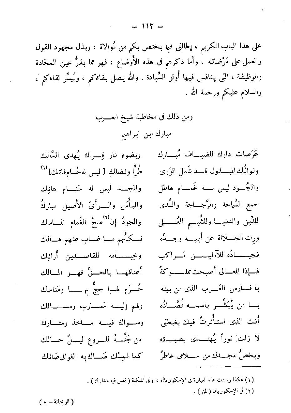 وَمن ذَلِك فِي مُخَاطبَة شيخ الْعَرَب مبارك ابْن إِبْرَاهِيم