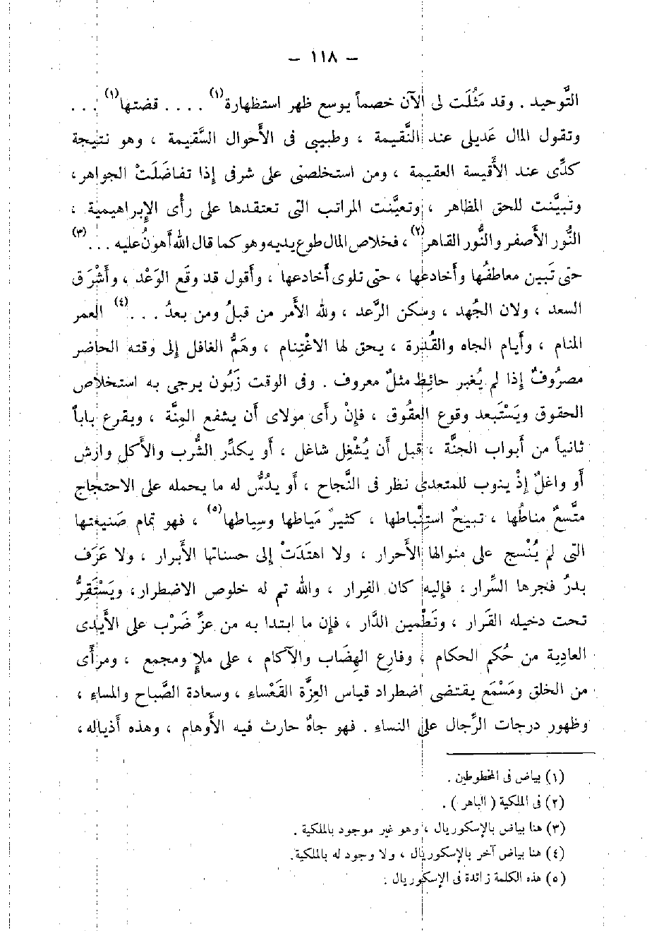 التَّوْحِيد. وَقد مثلت لي الْآن خصما يُوسع ظهر استظهارة ... . قضتها ... وَتقول المَال عديلي عِنْد النقيمة، وطبيبي فِي الْأَحْوَال السقيمة، وَهُوَ نتيجة كدي عِنْد الأقيسة العقيمة، وَمن استخلصني على شرفي إِذا تفاضلت الْجَوَاهِر، وتبينت للحق الْمظَاهر، وتعينت الْمَرَاتِب الَّتِي تعتقدها على رَأْي الإبراهيمية، النُّور الْأَصْفَر والنور القاهر، فخلاص المَال طوع يَدَيْهِ وَهُوَ كَمَا قَالَ الله أَهْون عَلَيْهِ ... حَتَّى تبين معاطفها وأخادعها، حَتَّى تلوى أخادعها، وَأَقُول قد وَقع الْوَعْد، وأشرق السعد، ولان الْجهد، وَسكن الرَّعْد، وَللَّه الْأَمر من قبل وَمن بعد ... الْعُمر الْمَنَام، وَأَيَّام الجاه وَالْقُدْرَة، يحِق لَهَا الاغتنام، وهم الغافل إِلَى وقته الْحَاضِر مَصْرُوف إِذا لم يغبر حَائِط مثل مَعْرُوف. وَفِي الْوَقْت زبون يُرْجَى بِهِ استخلاص الْحُقُوق ويستبعد وُقُوع العقوق، فَإِن رأى مولَايَ أَن يشفع الْمِنَّة، ويقرع بَابا ثَانِيًا من أَبْوَاب الْجنَّة، قبل أَن يشغل شاغل، أَو يكدر الشّرْب وَالْأكل وارش أَو واغل إِذْ يَنُوب للمتعدى نظر فِي النجاح، أَو يدس لَهُ مَا يحملهُ على الِاحْتِجَاج متسع مناطها، تبيح استنباطها، كثير مياطها وسياطها، فَهُوَ تَمام صنيعتها الَّتِي لم ينسج على منوالها الْأَحْرَار، وَلَا اهتدت إِلَى حسناتها الْأَبْرَار، وَلَا عرف بدر فجرها السرَار، فإليه كَانَ الْفِرَار، وَالله تمّ لَهُ خلوص الإضطرار، ويستقر تَحت دخيله الْقَرار، وتطمين الدَّار، فَإِن مَا ابتدا بِهِ من عز ضرب على الْأَيْدِي العادية من حكم الْحُكَّام، وفارع الهضاب والآكام، على ملإ وَمجمع، ومرأى من الْخلق ومسمع يقتضى اضطراد قِيَاس الْعِزَّة القعساء، وسعادة الصَّباح والمساء، وَظُهُور دَرَجَات الرِّجَال على النِّسَاء. فَهُوَ جاه حَارِث فِيهِ الأوهام، وَهَذِه أذياله،