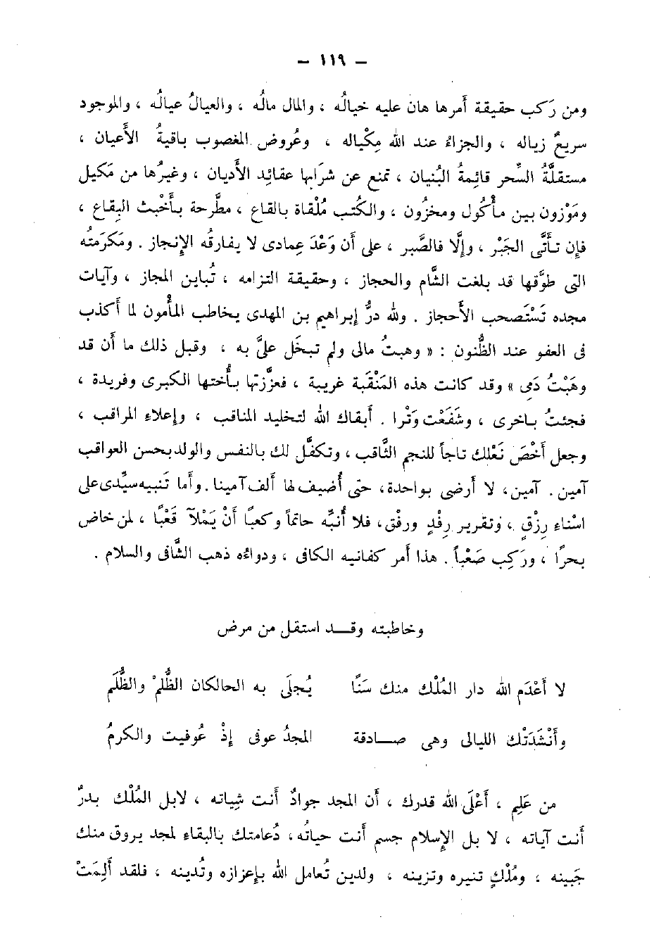 من علم، أَعلَى الله قدرك، أَن الْمجد جواد أَنْت شياته، لَا بل الْملك بدر أَنْت آيَاته، لَا بل الْإِسْلَام جسم أَنْت حَيَاته، دعامتك بِالْبَقَاءِ لمجد يروق مِنْك جَبينه، وَملك تنيره وتزينه، وَلدين تعامل الله بإعزازه وتدينه، فَلَقَد ألمت