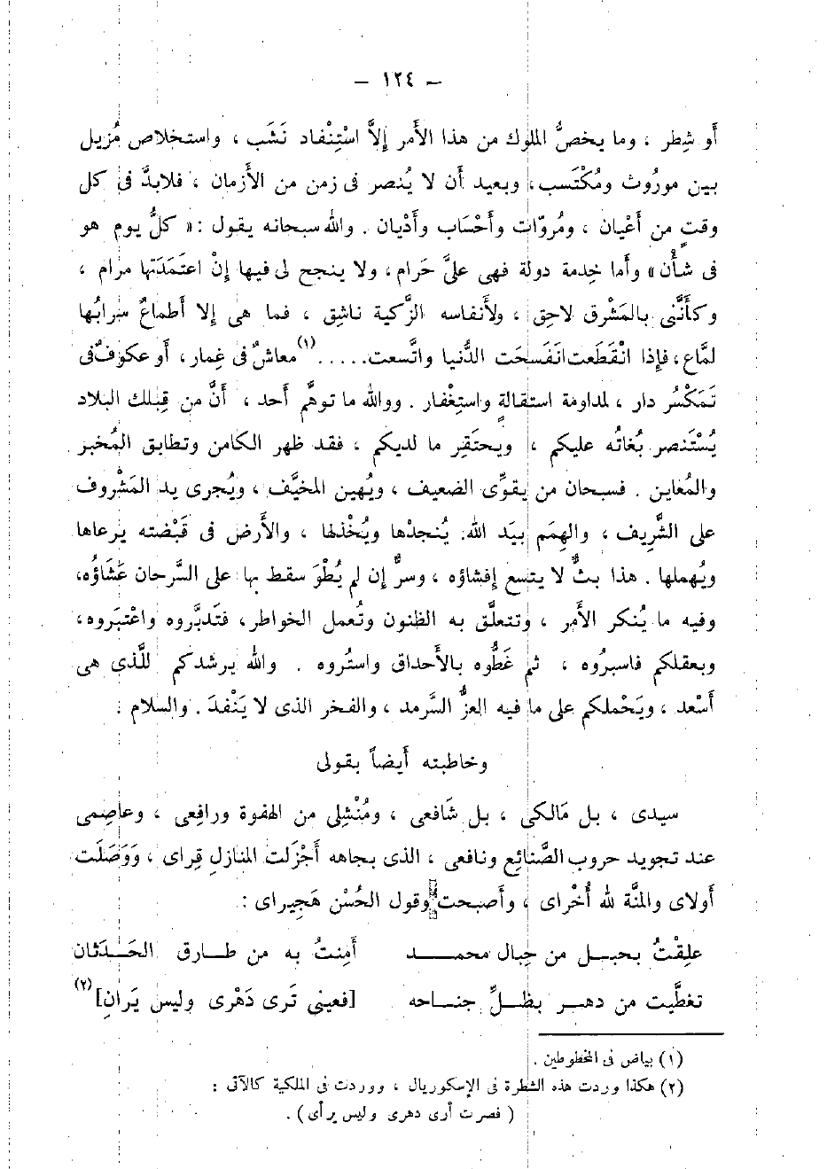 أَو شطر، وَمَا يخص الْمُلُوك من هَذَا الْأَمر إِلَّا استنفاد نشب، واستخلاص مزيل بَين موروث ومكتسب، وبعيد أَن لَا ينصر فِي زمن من الْأَزْمَان، فَلَا بُد فِي كل وَقت من أَعْيَان، ومروات وأحساب وأديان. وَالله سُبْحَانَهُ يَقُول: {كل يَوْم هُوَ فِي شَأْن} وَأما خدمَة دولة فَهِيَ على حرَام، وَلَا ينجح لي فِيهَا إِن اعتمدتها مرام، وكأنني بالمشرق لَاحق، ولأنفاسه الزكية ناشق، فَمَا هِيَ إِلَّا أطماع سرابها لماع، فَإِذا انْقَطَعت انفسحت الدُّنْيَا واتسعت ... . . معاش فِي غمار، أَو عكوف فِي تمكسر دَار، لمداومة استقالة واستغفار. وَوَاللَّه مَا توهم أحد، أَن من قبلك الْبِلَاد يستنصر بغاته عَلَيْكُم، ويحتقر مَا لديكم، فقد ظهر الكامن وتطابق الْمخبر والمعاين. فسبحان من يُقَوي الضَّعِيف، ويهين المخيف، وَيجْرِي يَد المشروف على الشريف، والهمم بيد الله. ينجدها ويخذلها، وَالْأَرْض فِي قَبضته يرعاها ويهملها. هَذَا بَث لَا يَتَّسِع إفشاؤه، وسر إِن لم يطو سقط بهَا على السرحان عشاؤه، وَفِيه مَا يُنكر الْأَمر، وتتعلق بِهِ الظنون وتعمل الخواطر، فتدبروه واعتبروه، وبعقلكم فاسبروه، ثمَّ غطوه بالأحداق واستروه. وَالله يرشدكم للَّذي هِيَ أسعد، ويحملكم على مَا فِيهِ الْعِزّ السرمد، وَالْفَخْر الَّذِي لَا ينْفد. وَالسَّلَام.