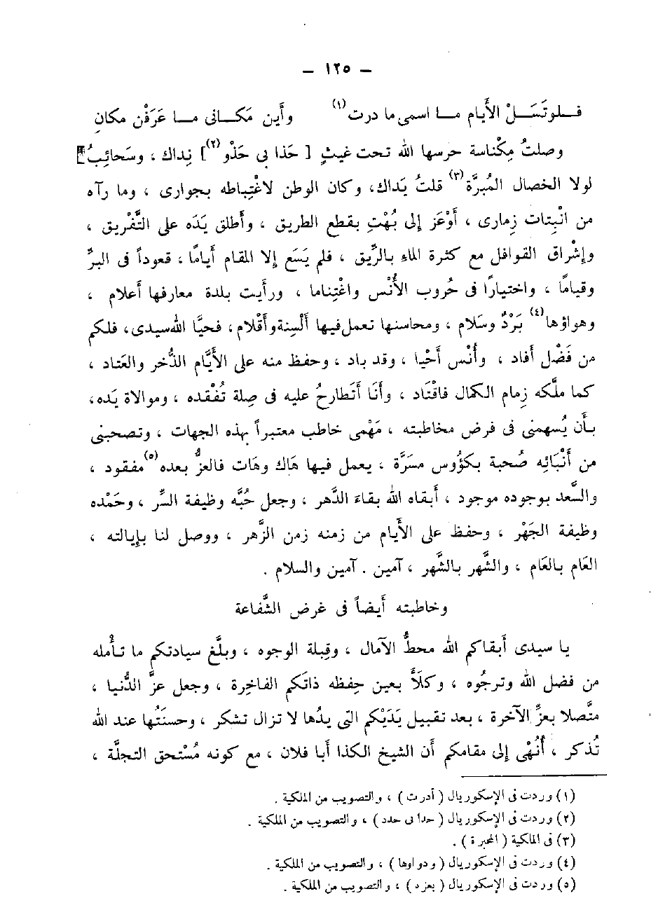 وصلت مكناسة حرسها الله تَحت غيث [حذا بِي حَذْو] نداك، وسحائب لَوْلَا الْخِصَال المبرة قلت يداك، وَكَانَ الوطن لاغتباطه بِجوَارِي، وَمَا رَآهُ من انبتات زمارى، أوعز إِلَى بهت بِقطع الطَّرِيق، وَأطلق يَده على التَّفْرِيق، وإشراق القوافل مَعَ كَثْرَة المَاء بالريق، فَلم يسع إِلَّا الْمقَام أَيَّامًا، قعُودا فِي الْبر وقياما، واختيارا فِي حروب الْأنس واغتناما، وَرَأَيْت بَلْدَة معارفها أَعْلَام، وهواؤها برد وَسَلام، ومحاسنها تعْمل فِيهَا أَلْسِنَة وَأَقْلَام، فَحَيَّا الله سَيِّدي، فلكم من فضل أَفَادَ، وَأنس أَحْيَا، وَقد باد، وَحفظ مِنْهُ على الْأَيَّام الذخر والعتاد، كَمَا ملكه زِمَام الْكَمَال فاقتاد، وَأَنا أتطارح عَلَيْهِ فِي صلَة تفقده، وموالاة يَده، بِأَن يسهمني فِي فرض مخاطبته، مهمى خَاطب مُعْتَبرا بِهَذِهِ الْجِهَات، وتصحبني من أنبائه صُحْبَة بكؤوس مَسَرَّة، يعْمل فِيهَا هاك وهات فالعز بعده مَفْقُود، والسعد بِوُجُودِهِ مَوْجُود، أبقاه الله بَقَاء الدَّهْر، وَجعل حبه وَظِيفَة السِّرّ، وحمده وَظِيفَة الْجَهْر، وَحفظ على الْأَيَّام من زَمَنه زمن الزهر، وَوصل لنا بإيالته، الْعَام بِالْعَام، والشهر بالشهر، آمين. آمين وَالسَّلَام.