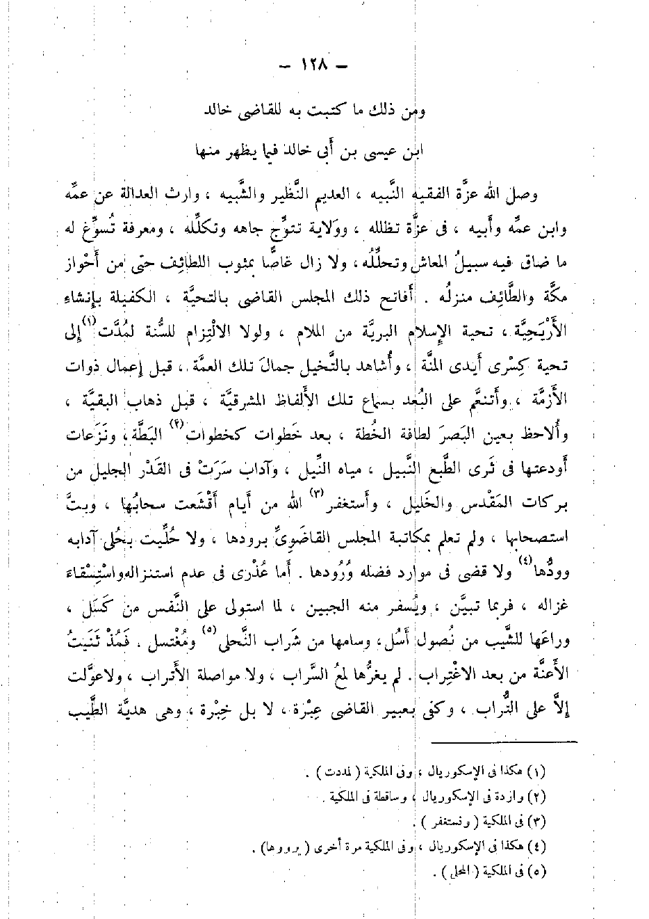 وَمن ذَلِك مَا كتبت بِهِ للْقَاضِي خَالِد ابْن عِيسَى بن أبي خَالِد فِيمَا يظْهر مِنْهَا