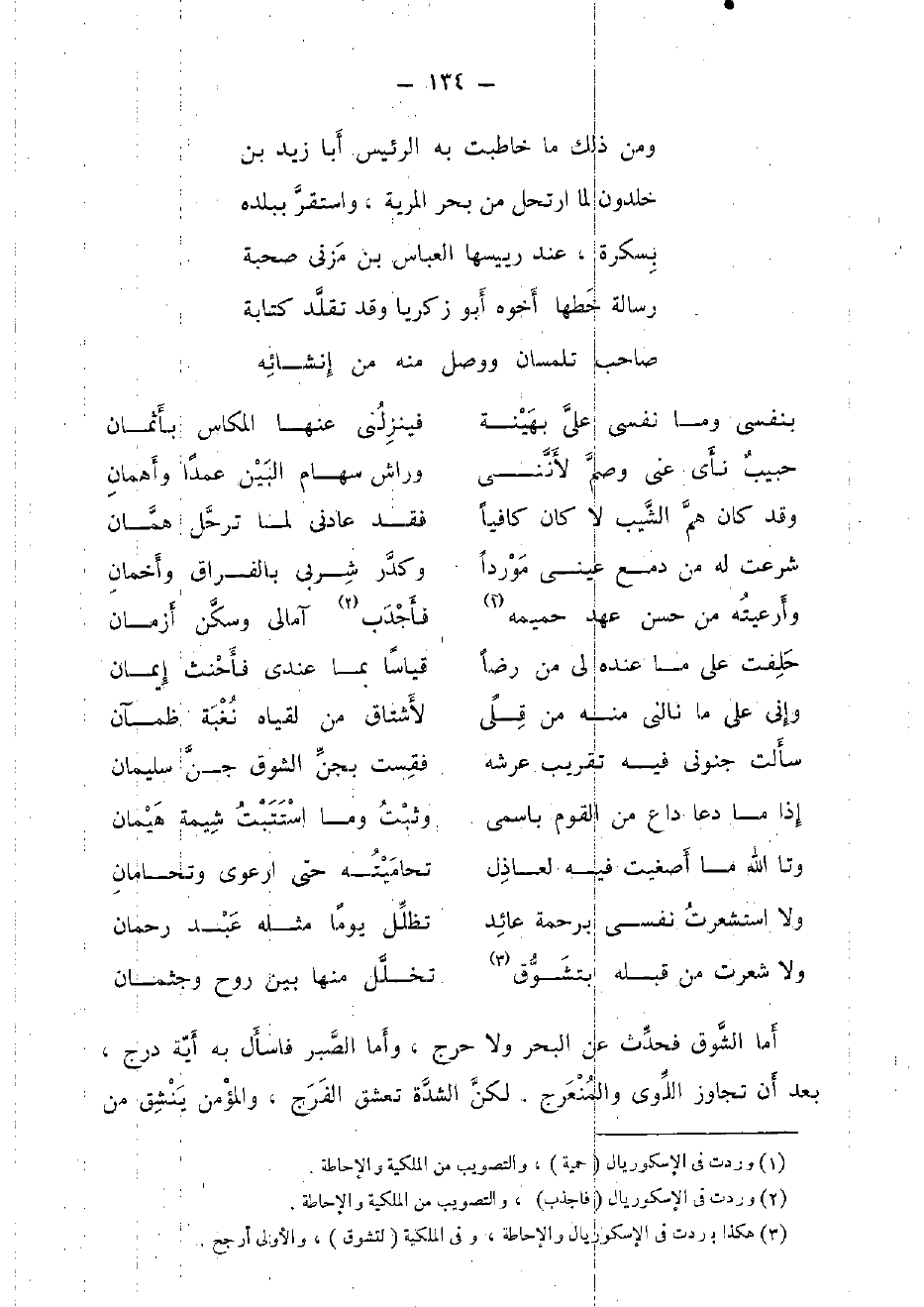 وَمن ذَلِك مَا خاطبت بِهِ الرئيس أَبَا زيد بن خلدون لما ارتحل من بَحر المرية، وَاسْتقر بِبَلَدِهِ بسكرة، عِنْد رييسها الْعَبَّاس بن مزنى صُحْبَة رِسَالَة خطها أَخُوهُ أَبُو زَكَرِيَّا وَقد تقلد كِتَابَة صَاحب تلمسان وَوصل مِنْهُ من إنشائه