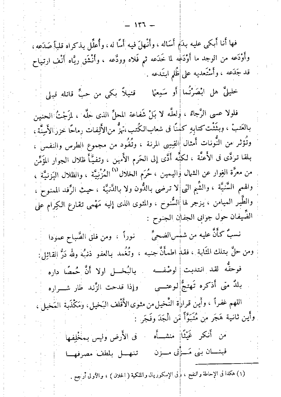 فلولا عَسى الرَّجَاء، وَلَعَلَّه لَا بل شَفَاعَة الْمحل الَّذِي حلّه، لمزجت الحنين بالعتب، وبثثت كِتَابه كمنا فِي شعاب الْكتب، تهز من الألفات رماحا خزر الأسنة، وتؤثر من النونات أَمْثَال القسى المرنة، وتقود من مَجْمُوع الطرس وَالنَّفس، بلقا تردى فِي الأعنة، لكنه أدّى إِلَى الْحرم الْأمين، وتفيأ ظلال الْجوَار الْمُؤمن من معرة الغوار عَن الشمَال وَالْيَمِين، حرم الْخلال المزنية، والظلال اليزنية، والهمم السّنيَّة، والشيم الَّتِي لَا ترْضى بالدون وَلَا بالدنية، حَيْثُ الرفد الممنوح، وَالطير الميامن، يزْجر لَهَا السنوح، والمثوى الَّذِي إِلَيْهِ مهمى تقارع الْكِرَام على الضيفان حول جوابي الجفان الجنوح: