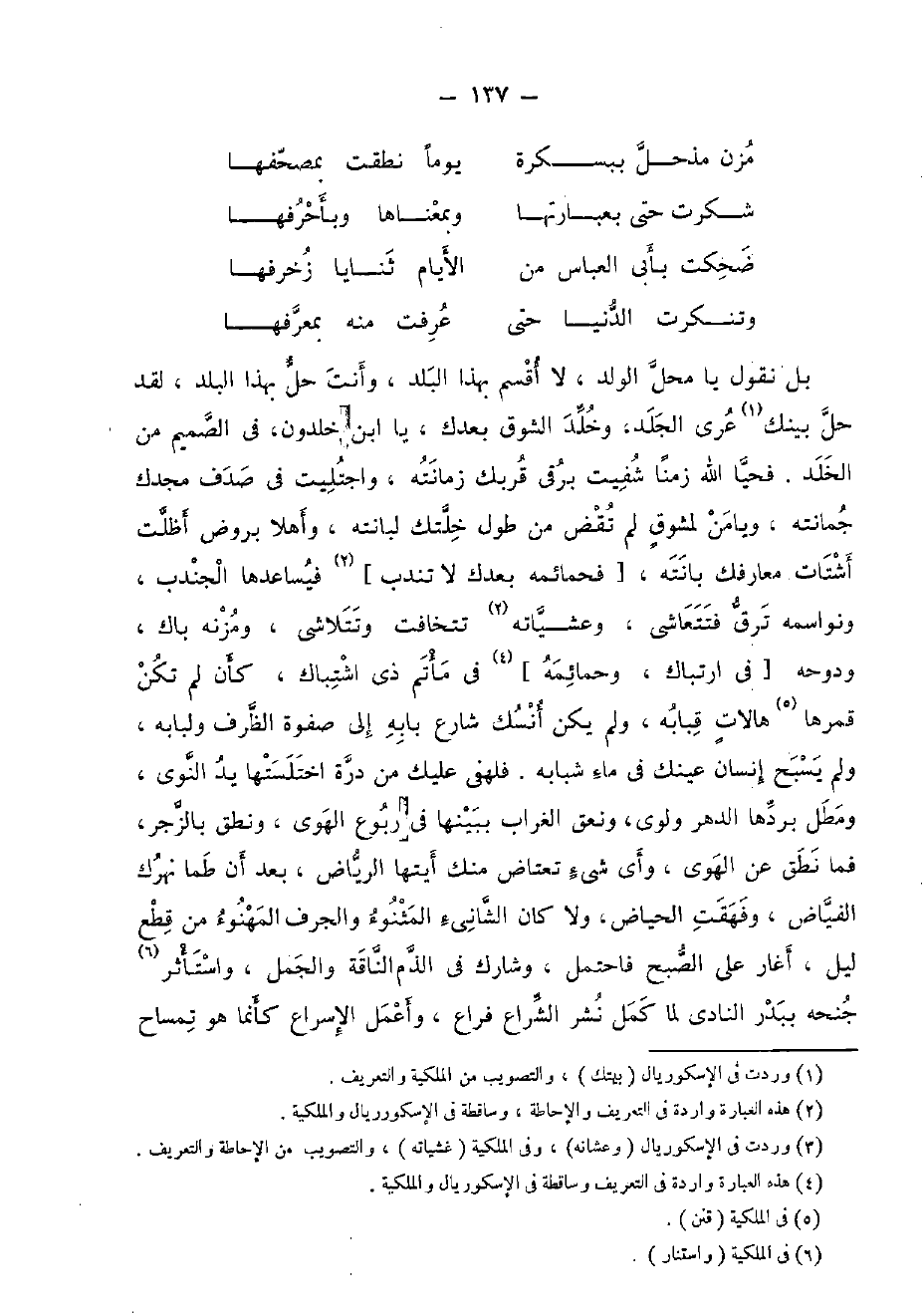 بل نقُول يَا مَحل الْوَلَد، لَا أقسم بِهَذَا الْبَلَد، وَأَنت حل بِهَذَا الْبَلَد، لقد حل بَيْنك عرى الْجلد، وخلد الشوق بعْدك، يَا ابْن خلدون، فِي الصميم من الْخلد. فَحَيَّا الله زَمنا شفيت برقى قربك زمانته، واجتليت فِي صدف مجدك جمانته، ويامن لمشوق لم تقض من طول خلتك لبانته، وَأهلا بروض أظلت أشتات معارفك بانته، [فحمائمه بعْدك لَا تندب] فيساعدها الجندب، ونواسمه ترق فتتعاشى، وعشياته تتخافت وتتلاشى، ومزنه باك، ودوحه [فِي ارتباك، وحمائمه] فِي مأتم ذِي اشتباك، كَأَن لم تكن قمرها هالات قبابه، وَلم يكن أنسك شَارِع بَابه إِلَى صفوة الظّرْف ولبابه، وَلم يسبح إِنْسَان عَيْنك فِي مَاء شبابه. فلهفي عَلَيْك من درة اختلستها يَد النَّوَى، ومطل بردهَا الدَّهْر ولوى، ونعق الْغُرَاب ببينها فِي ربوع الْهوى، ونطق بالزجر، فَمَا نطق عَن الْهوى، وَأي شَيْء تعتاض مِنْك أيتها الرياض، بعد أَن طما نهرك الْفَيَّاض، وفهقت الْحِيَاض، وَلَا كَانَ الشانيء المثنوء والجرف المهنوء من قطع ليل، أغار على الصُّبْح فَاحْتمل، وشارك فِي الذَّم النَّاقة والجمل، واستأثر جنحه ببدر النادي لما كمل نشر الشراع فراع، وأعمل الْإِسْرَاع كَأَنَّمَا هُوَ تمساح