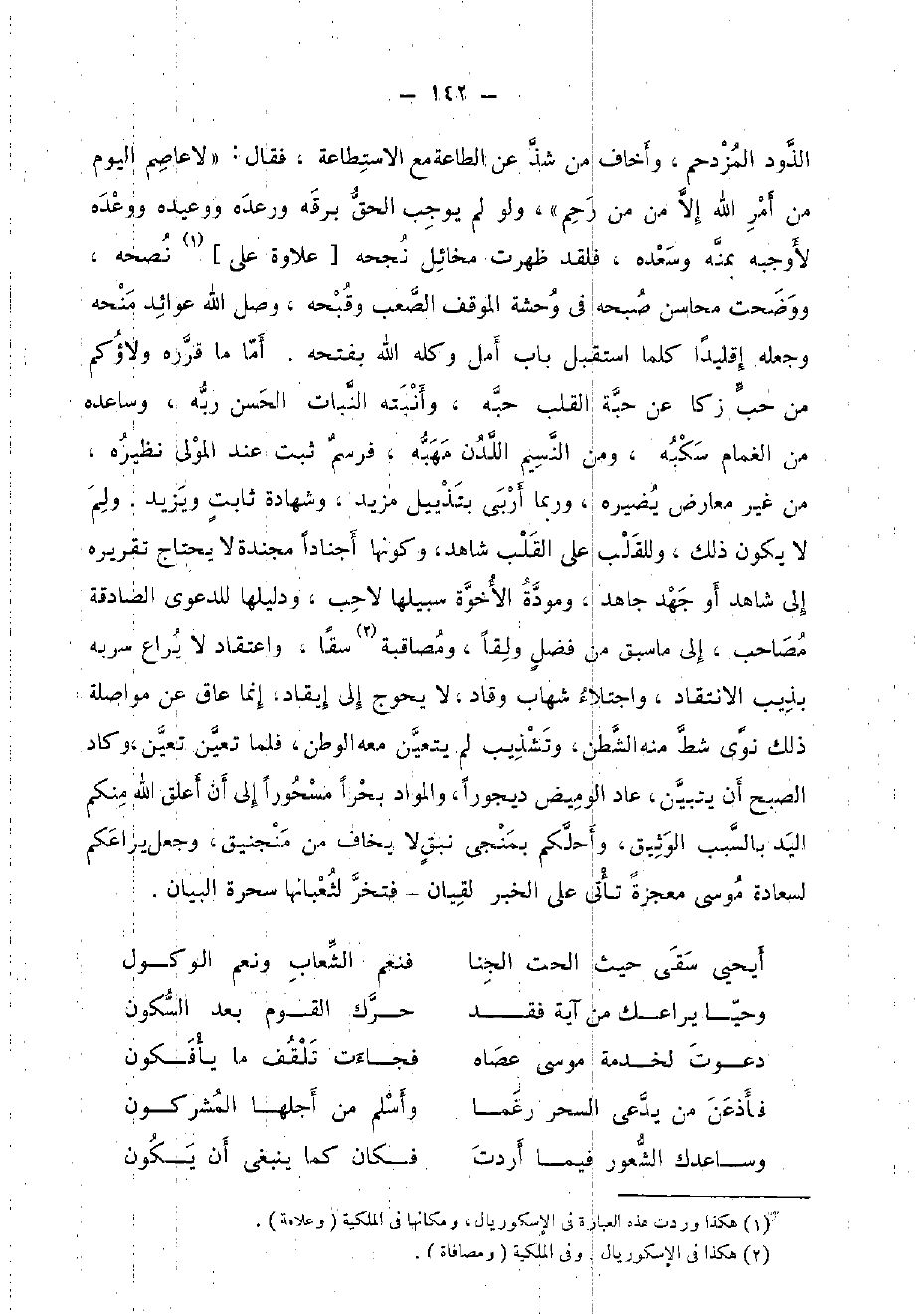 الذود المزدحم، وأخاف من شَذَّ عَن الطَّاعَة مَعَ الِاسْتِطَاعَة، فَقَالَ: {" لَا عَاصِم الْيَوْم من أَمر الله إِلَّا من من رحم "} ، وَلَو لم يُوجب الْحق برقه ورعده ووعيده ووعده لأوجبه بمنه وسعده، فَلَقَد ظَهرت مخائل نجحه [علاوة على] نصحه، ووضحت محَاسِن صبحه فِي وَحْشَة الْموقف الصعب وقبحه، وصل الله عوائد منحه وَجعله إقليدا كلما اسْتقْبل بَاب أمل وَكله الله بفتحه. أما مَا قَرَّرَهُ ولاؤكم من حب زكا عَن حَبَّة الْقلب حبه، وأنبته النَّبَات الْحسن ربه، وساعده من الْغَمَام سكبه، وَمن النسيم اللدن مهبه، فرسم ثَبت عِنْد الْمولى نَظِيره، من غير معَارض يضيره، وَرُبمَا أربى بتذييل مزِيد، وَشَهَادَة ثَابت وَيزِيد. وَلم لَا يكون ذَلِك، وللقلب على الْقلب شَاهد، وَكَونهَا أجنادا مجندة لَا يحْتَاج تَقْرِيره إِلَى شَاهد أَو جهد جَاهد، ومودة الْأُخوة سَبِيلهَا لاحب، ودليلها للدعوى الصادقة مصاحب، إِلَى مَا سبق من فضل ولقا، ومصاقبة سقا، واعتقاد لَا يراع سربه بذيب الانتقاد، واجتلاء شهَاب وقاد، لَا يحوج إِلَى إيقاد، إِنَّمَا عَاق عَن مُوَاصلَة ذَلِك نوى شط مِنْهُ الشطن، وتشذيب لم يتَعَيَّن مَعَه الوطن، فَلَمَّا تعين تعين، وَكَاد الصُّبْح أَن يتَبَيَّن، عَاد الوميض ديجورا، والمواد بحرا مسحورا إِلَى أَن أعلق الله مِنْكُم الْيَد بِالسَّبَبِ الوثيق، وأحلكم بمنجى نبق لَا يخَاف من منجنيق، وَجعل يراعكم لسعادة مُوسَى معْجزَة تأتى على الْخَبَر لقيان - فتخر لثعبانها سحرة الْبَيَان.