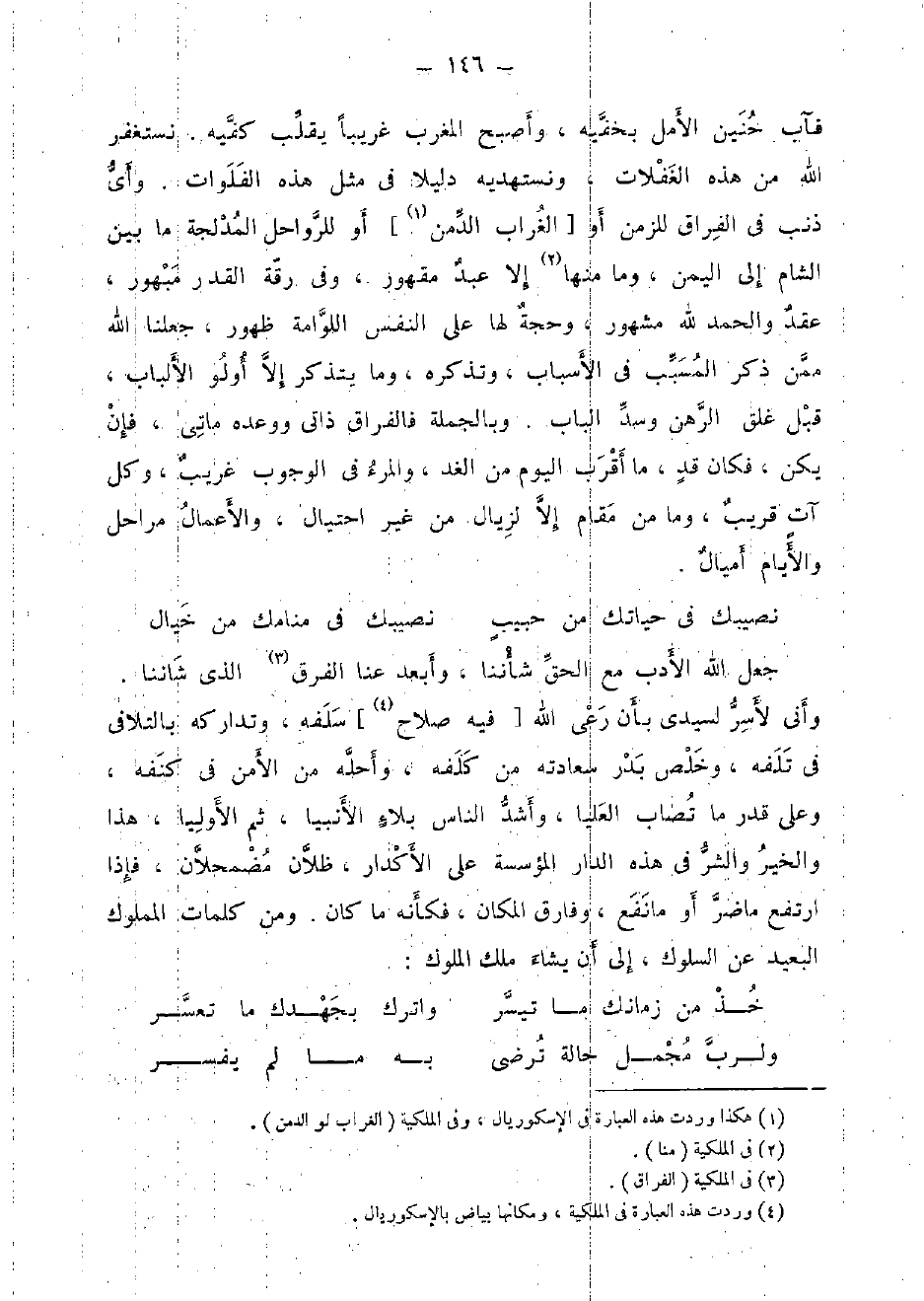 فآب حنين الأمل بخفيه، وَأصْبح الْمغرب غَرِيبا يقلب كفيه. نَسْتَغْفِر الله من هَذِه الغفلات، ونستهديه دَلِيلا فِي مثل هَذِه الفلوات. وأى ذَنْب فِي الْفِرَاق للزمن أَو [الْغُرَاب الدمن] أَو للرواحل المدلجة مَا بَين الشَّام إِلَى الْيمن، وَمَا مِنْهَا إِلَّا عبد مقهور، وَفِي رقة الْقدر مبهور، عقد وَالْحَمْد لله مَشْهُور، وَحجَّة لَهَا على النَّفس اللوامة ظُهُور، جعلنَا الله مِمَّن ذكر الْمُسَبّب فِي الْأَسْبَاب، وتذكره، وَمَا يتَذَكَّر إِلَّا أولو الْأَلْبَاب، قبل غلق الرَّهْن وسد الْبَاب. وَبِالْجُمْلَةِ فالفراق ذاتي ووعده ماتي، فَإِن يكن، فَكَانَ قد، مَا أقرب الْيَوْم من الْغَد، والمرء فِي الْوُجُوب غَرِيب، وكل آتٍ قريب، وَمَا من مقَام إِلَّا لزيال من غير احتيال، والأعمال مراحل وَالْأَيَّام أَمْيَال.
