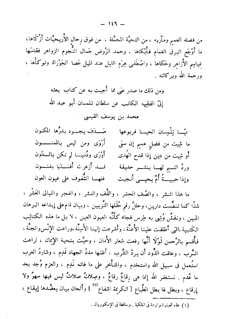 وَمن ذَلِك مَا صدر عني مِمَّا أجبْت بِهِ عَن كتاب بَعثه إِلَى الْفَقِيه الْكَاتِب عَن سُلْطَان تلمسان أَبُو عبد الله مُحَمَّد بن يُوسُف الْقَيْسِي
