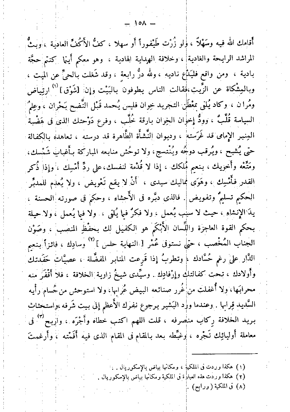 أقامك الله فِيهِ وسهلا، وَلَو زرت طيفورا أَو سهلا، كف الأكف العادية، وَبث المراشد الرايحة والغادية، وَخِلَافَة الْهِدَايَة الهادية، وَهُوَ مَعكُمْ أَيْنَمَا كُنْتُم حجَّة بادية، وَمن وَاقع فَليدع نَادِيه، وَللَّه در رَابِعَة، وَقد شغلت بالحي عَن الْمَيِّت، وبالمشكاة عَن الزَّيْت، فَقَالَت النَّاس يطوفون بِالْبَيْتِ وَإِن [شوق] ارتياض ومران، وَكَاد يلفي بمعطن التَّجْرِيد خوان فَلَيْسَ يحمد قبل النَّضْح بحران، وَعلم السياسة قلب، وود إخْوَان الخوان بارقة خلب، وَفرع دوحتك الَّذِي فِي هضبة الْمِنْبَر الإمامي قد غرسته، وديوان النشأة الطاهرة قد درسته، تعاهده بِالْكَفَالَةِ حَتَّى يشبح، ويرقب دوحه وينتسج، وَلَا توحش منابعه الْمُبَارَكَة بأغباب شمسك، ومتعه وأخويك، بنعيم ملكك، إِذا لَا قدمة لنَفسك، على رد أمسك، وَإِذا ذكر الْقدر فَأمْسك، وَهوى مماليك سَيِّدي، أَن لَا يَقع تعويض، وَلَا يعْدم للمدبر الْحَكِيم تَسْلِيم وتفويض. فَالَّذِي دبره فِي الأحشاء، وَحكم فِي صورته الْحَسَنَة، يَد الْإِنْشَاء، حَيْثُ لَا سَبَب يعْمل، وَلَا فكر فِيمَا يلقى، وَلَا فِيمَا يعْمل، وَلَا حِيلَة بِحكم الْقُوَّة العاجزة وَاللِّسَان الأبكم هُوَ الْكَفِيل لَك بِحِفْظ المنصب، وصون الجناب المخصب، حَتَّى نستوفي عمر: [النِّهَايَة حلْس] وِسَادك فائزا بنعيم الدَّار على رغم حسادك، وتطرب إِذا قرعت المنابر المفضلة، عصيات حفدتك وأولادك، تَحت كفالتك وإرفادك. وسيدي شيخ زَاوِيَة الْخلَافَة، فَلَا أقفر مِنْهُ مِحْرَابهَا، وَلَا أغفلت من غرر صنائعه الْبيض عرابها، وَلَا استوحش من حسام رَأْيه السديد قرابها. وعندما ورد البشير بِرُجُوع نفرك الْأَعْظَم إِلَى بَيت شرفه، واستحثاث بريد الْخلَافَة ركاب مُنْصَرفه، قلت اللَّهُمَّ اكْتُبْ خطاه وأجره، واربح فِي مُعَاملَة أوليائك تجره، وغبطه بعد بالْمقَام فِي الْمقَام الَّذِي فِيهِ أفمته، وأرغمت