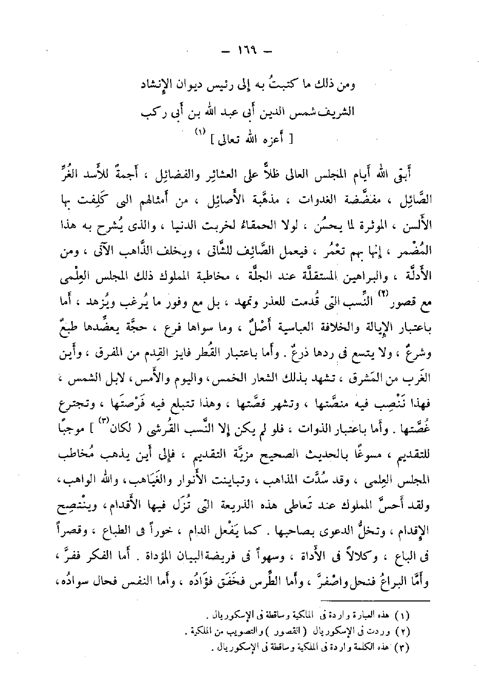 أبقى الله أَيَّام الْمجْلس العالي ظلا على العشائر والفضائل، أجمة للأسد الغر الصَّائِل، مفضضة الغدوات، مذهبَة الأصائل، من أمثالهم الَّتِي كلفت بهَا الألسن، الموثرة لما يحسن، لَوْلَا الحمقاء لخربت الدُّنْيَا، وَالَّذِي يشْرَح بِهِ هَذَا الْمُضمر، إِنَّهَا بهم تعمر، فَيعْمل الصَّائِف للشاتي، ويخلف الذَّاهِب الْآتِي، وَمن الْأَدِلَّة، والبراهين المستقلة عِنْد الجلة، مُخَاطبَة الْمَمْلُوك ذَلِك الْمجْلس العلمي مَعَ قُصُور النّسَب الَّتِي قدمت للْعُذْر وتمهد، بل مَعَ وفور مَا يرغب ويزهد، أما بِاعْتِبَار الإيالة والخلافة العباسية أصل، وَمَا سواهَا فرع، حجَّة يعضدها طبع وَشرع، وَلَا يَتَّسِع فِي ردهَا ذرع. وَأما بِاعْتِبَار الْقطر فايز الْقدَم من المفرق، وَأَيْنَ الغرب من الْمشرق، تشهد بذلك الشعار الْخمس، وَالْيَوْم والأمس، لَا بل الشَّمْس، فَهَذَا ننصب فِيهِ منصتها، وتشهر قصَّتهَا، وَهَذَا تتبلع فِيهِ فرصتها، وتجترع غصتها. وَأما بِاعْتِبَار الذوات، فَلَو لم يكن إِلَّا النّسَب الْقرشِي (لَكَانَ] مُوجبا للتقديم، مسوغا بِالْحَدِيثِ الصَّحِيح مزية التَّقْدِيم، فَإلَى أَيْن يذهب مُخَاطب الْمجْلس العلمي، وَقد سدت الْمذَاهب، وتباينت الْأَنْوَار والغياهب، وَالله الْوَاهِب، وَلَقَد أحس الْمَمْلُوك عِنْد تعَاطِي هَذِه الذريعة الَّتِي تزل فِيهَا الْأَقْدَام، وينتصح الْإِقْدَام، وتخل الدَّعْوَى بصاحبها. كَمَا يفعل الدام، خورا فِي الطباع، وقصرا فِي الباع، وكلالا فِي الأداة، وسهوا فِي فَرِيضَة الْبَيَان المؤداة. أما الْفِكر ففر، وَأما البراع فنحل واصفر، وَأما الطرس فخفق فُؤَاده، وَأما النَّفس فحال سوَاده،
