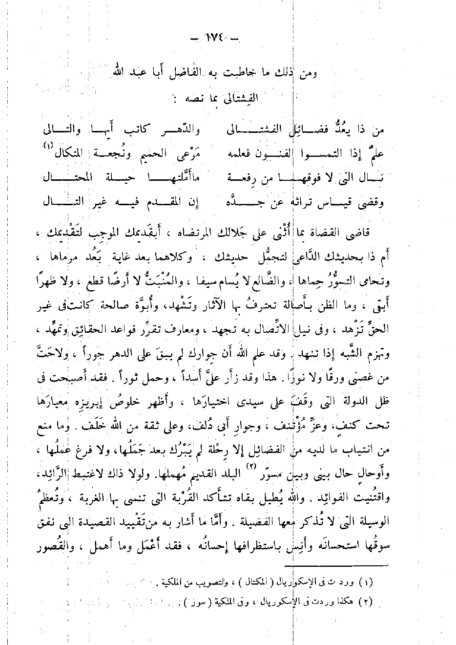 وَمن ذَلِك مَا خاطبت بِهِ الْفَاضِل أَبَا عبد الله الفشتالي بِمَا نَصه: