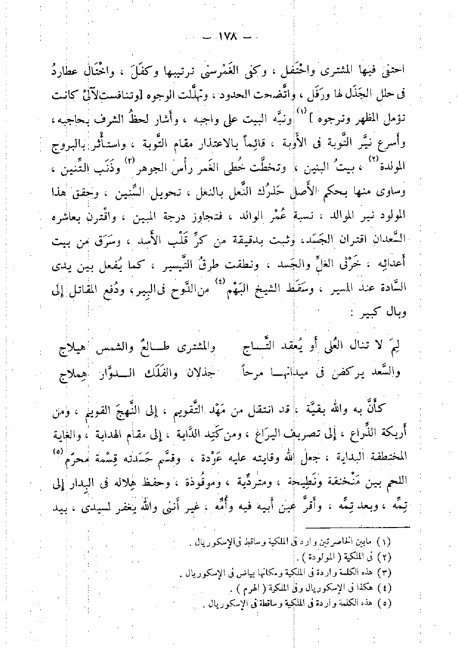 احتفى فِيهَا المُشْتَرِي واحتفل، وَكفى الْغمر سنى ترتيبها وكفل، واختال عُطَارِد فِي حلل الجذل لَهَا ورفل، واتضحت الْحُدُود، وتهللت الْوُجُوه [وتنافست لآلىء كَانَت تؤمل الْمظهر وترجوه] وَنبهَ الْبَيْت على واجبه، وَأَشَارَ لحظ الشّرف بحاجبه، وأسرع نير التَّوْبَة فِي الأوبة، قَائِما بالاعتذار مقَام التَّوْبَة، واستأثر بالبروج المولدة، بَيت الْبَنِينَ، وتخطت خطى الْغمر رَأس الْجَوْهَر وذنب التنين، وساوى مِنْهَا بِحكم الأَصْل حذرك النَّعْل بالنعل، تَحْويل السنين، وحقق هَذَا الْمَوْلُود نير الموالد، نِسْبَة عمر الْوَالِد، فَتَجَاوز دَرَجَة الْمُبين، واقترن بعاشره السعدان اقتران الْجَسَد، وَثَبت بدقيقة من كرّ قلب الْأسد، وسرق من بَيت أعدائه، خرثى الغل والجسد، ونطقت طرق التَّيْسِير، كَمَا يفعل بَين يَدي السَّادة عِنْد الْمسير، وَسقط الشَّيْخ البهم من الدوح فِي البير، وَدفع الْمقَاتل إِلَى وبال كَبِير: