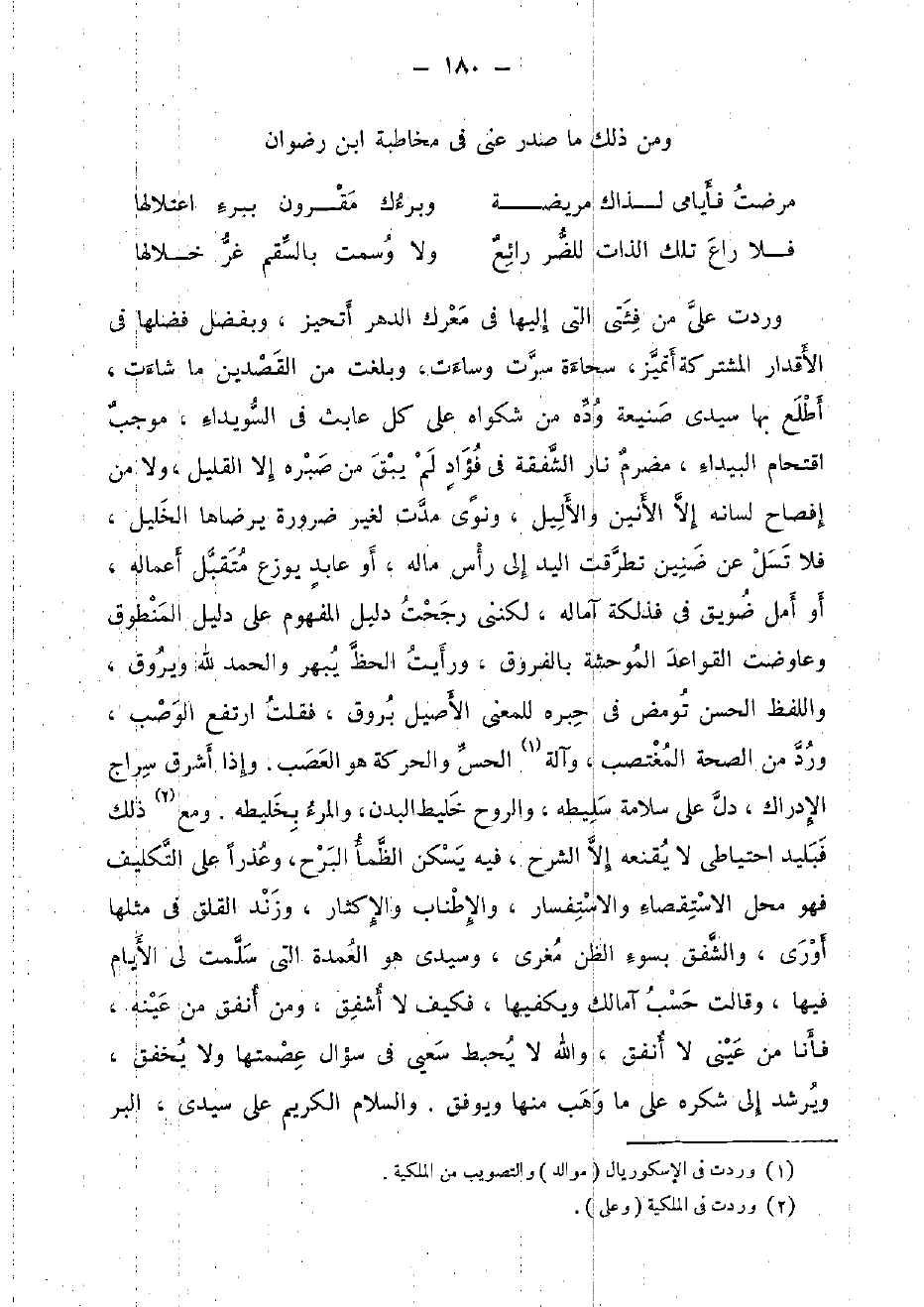 وَردت على من فئتي الَّتِي إِلَيْهَا فِي معرك الدَّهْر أتحيز، وبفضل فَضلهَا فِي الأقدار الْمُشْتَركَة أتميز، سحاءة سرت وَسَاءَتْ، وَبَلغت من القصدين مَا شَاءَت، أطلع بهَا سَيِّدي صَنِيعَة وده من شكواه على كل عابث فِي السويداء، مُوجب اقتحام الْبَيْدَاء، مضرم نَار الشَّفَقَة فِي فؤاد لم يبْق من صبره إِلَّا الْقَلِيل، وَلَا من إفصاح لِسَانه إِلَّا الأنين والأليل، وَنوى مدت لغير ضَرُورَة يرضاها الْخَلِيل، فَلَا تسل عَن ضنين تطرقت الْيَد إِلَى رَأس مَاله، أَو عَابِد يوزع متقبل أَعماله، أَو أمل ضويق فِي فذلكة آماله، لكنني رجحت دَلِيل الْمَفْهُوم على دَلِيل الْمَنْطُوق وعاوضت الْقَوَاعِد الموحشة بالفروق، وَرَأَيْت الْحَظ يبهر وَالْحَمْد لله ويروق، وَاللَّفْظ الْحسن تُومِضْ فِي حبره للمعنى الْأَصِيل بروق، فَقلت ارْتَفع الوصب، ورد من الصِّحَّة المغتصب، وَآلَة الْحس وَالْحَرَكَة هُوَ العصب. وَإِذا أشرق سراج الْإِدْرَاك، دلّ على سَلامَة سليطه، وَالروح خليط الْبدن، والمرء بخليطه. وَمَعَ ذَلِك فبليد احتياطي لَا يقنعه إِلَّا الشَّرْح، فِيهِ يسكن الظمأ البرح، وعذرا على التَّكْلِيف فَهُوَ مَحل الِاسْتِقْصَاء والاستفسار، والإطناب والإكثار، وزند القلق فِي مثلهَا أورى، والشفق بِسوء الظَّن مغرى، وسيدي هُوَ الْعُمْدَة الَّتِي سلمت لي الْأَيَّام فِيهَا، وَقَالَت حسب آمالك ويكفيها، فَكيف لَا أشْفق، وَمن أنْفق من عينه، فَأَنا من عَيْني لَا أنْفق، وَالله لَا يحبط سعيى فِي سُؤال عصمتها وَلَا يخْفق، ويرشد إِلَى شكره على مَا وهب مِنْهَا ويوفق. وَالسَّلَام الْكَرِيم على سَيِّدي، الْبر