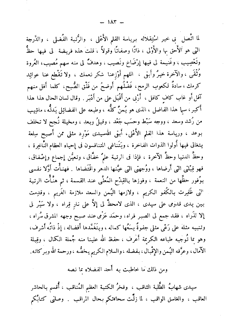سَيِّدي شهَاب الطّلبَة الثاقب، وفخر الكتبة الْعَظِيم المناقب، أقسم بالحاشر العاقب، والغاسق الواقب، لما زلت سحاءتكم بِحَال المراقب. وصلني كتابكُمْ