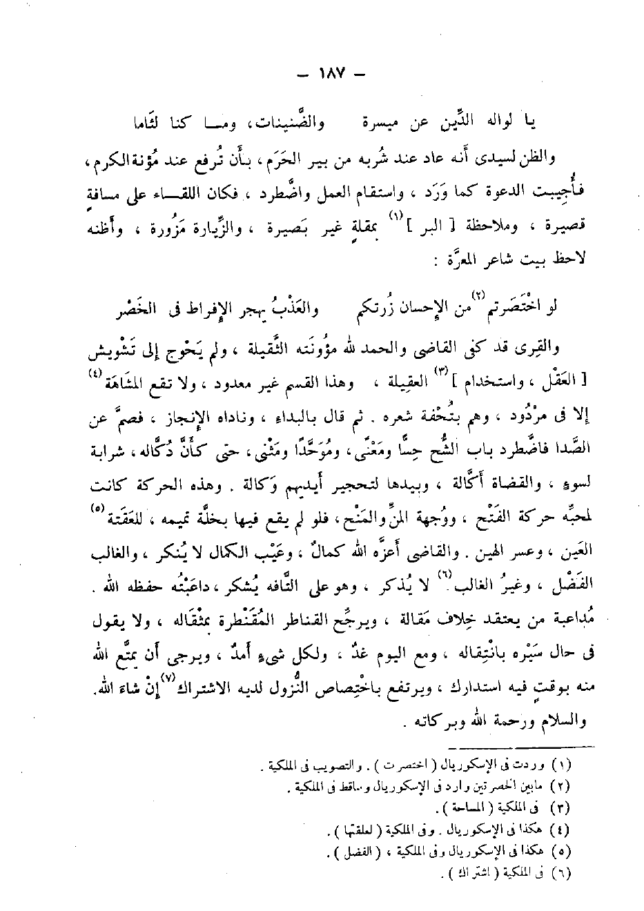 والقرى قد كفى القَاضِي وَالْحَمْد لله مؤونته الثَّقِيلَة، وَلم يحوج إِلَى تشويش [الْعقل، واستخدام] العقيلة، وَهَذَا الْقسم غير مَعْدُود، وَلَا تقع المشاهة إِلَّا فِي مَرْدُود، وهم يتحفه شعره. ثمَّ قَالَ بالبداء، وناداه الإنجاز، فَصم عَن الصدا فاضطرد بَاب الشُّح حسا وَمعنى، وموحدا ومثنى، حَتَّى كَأَن دكاله، شرابة لسوء، والقضاة أكالة، وبيدها لتحجير أَيْديهم وكَالَة. وَهَذِه الْحَرَكَة كَانَت المحبه حَرَكَة الْفَتْح، ووجهة الْمَنّ والمنح، فَلَو لم يَقع فِيهَا بخلة تميمه، للعقتة الْعين، وعسر الهين. وَالْقَاضِي أعزه الله كَمَال، وعيب الْكَمَال لَا يُنكر، وَالْغَالِب الْفضل، وَغير الْغَالِب لَا يذكر، وَهُوَ على التافه يشْكر، داعبته حفظه الله. مداعبة من يعْتَقد خلاف مقَالَة، وَيرجع القناطر المقنطرة بمثقاله، وَلَا يَقُول فِي حَال سيره بانتقاله، وَمَعَ الْيَوْم غَد، وَلكُل شَيْء أمد، ويرجى أَن يمتع الله مِنْهُ بِوَقْت فِيهِ اسْتِدْرَاك، ويرتفع باختصاص النُّزُول لَدَيْهِ الِاشْتِرَاك إِن شَاءَ الله. وَالسَّلَام وَرَحْمَة الله وَبَرَكَاته.