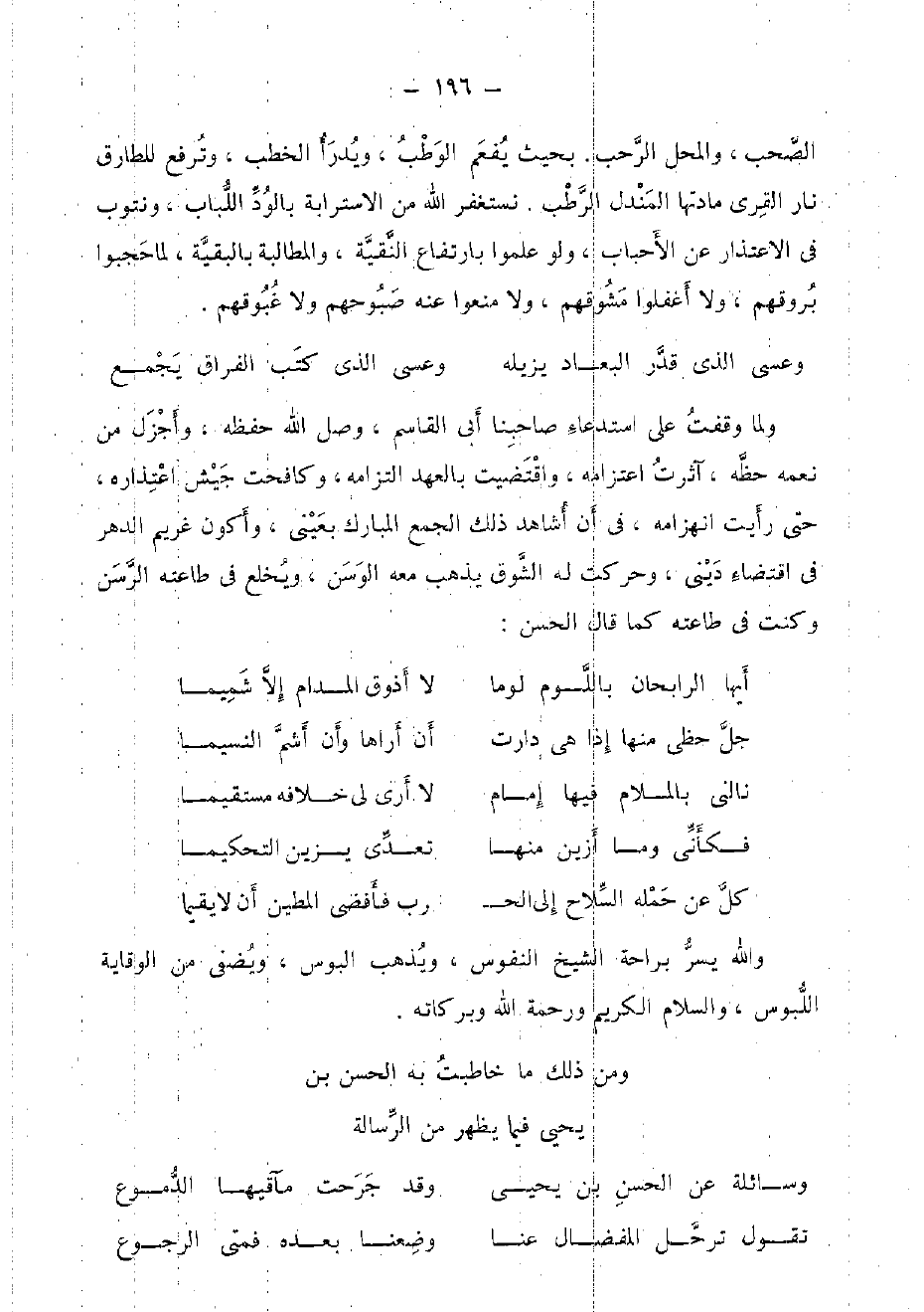 وَمن ذَلِك مَا خاطبت بِهِ الْحسن بن يحيى فِيمَا يظْهر من الرسَالَة