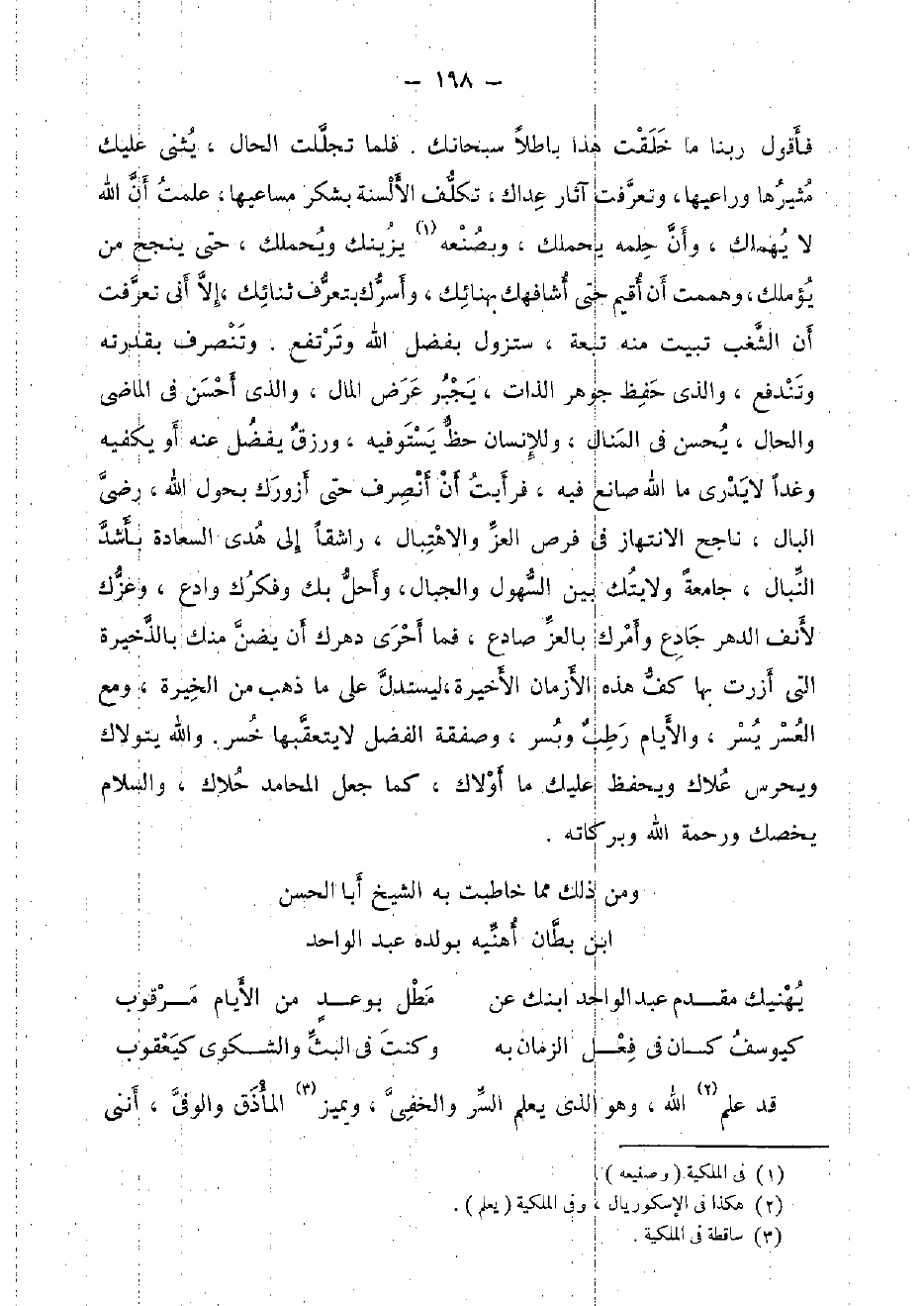 وَمن ذَلِك مِمَّا خاطبت بِهِ الشَّيْخ أَبَا الْحسن ابْن بطان أهنيه بولده عبد الْوَاحِد
