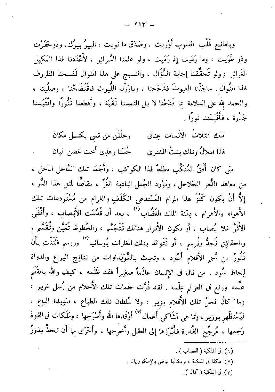 مَتى كَانَ أفق الْمنْكب مطلعا لهَذَا الْكَوْكَب، وأجمة تِلْكَ السَّاحِل الماحل، من معاهد الدمر الحلاحل، ومورد الْجمل الْبَادِيَة الغر، مقاصا لمثل هَذَا الدّرّ، إِلَّا أَن يكون كنز هَذَا المرام المستدعي الكلف والغرام من مستودعات تِلْكَ الْأَهْوَاء والأهرام، دمنة الْملك الغضاب، بعد أَن قدست الأنصاب، وأقفى الْأَثر فَلَا يصاب، أَو تكون الْأَنْوَار هُنَالك تتجسم، والحظوظ تعين وتقسم، والحقائق تحد وترسم، أَو تتوالد بِتِلْكَ المغارات يوسانيا وروسم ظَنَنْت بِأَن تثور من أجم الأقلام أسود، وتعبث بالسويداوات من نتائج اليراع والدواة لحاظ سود. من قَالَ فِي الْإِنْسَان عَالما صَغِيرا فقد ظلمه، كَيفَ وَالله بالقلم علمه وَرفع فِي العوالم علمه. لقد ذرت حلمات تِلْكَ الأحلام من رسل غرير، وَمَا كَانَ فَحل تِلْكَ الأقلام بزير، وَلَا سُلْطَان تِلْكَ الطباع، المديدة الباع، ليستظهر بوزير، إِنَّمَا هِيَ مشاكي أَعمال أوقدها الله وأسرجها، وملكات فِي الْقُوَّة رَجمهَا، مُرَجّح الْقُدْرَة فأبرزها إِلَى الْعقل وأخرجها، وَأَحْرَى بهَا أَن تحط بذور
