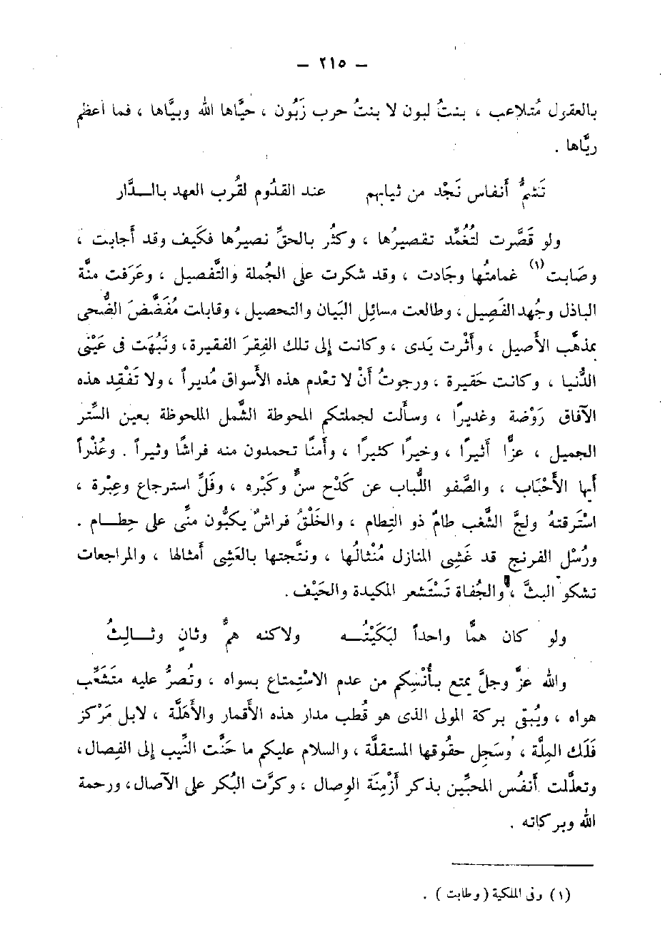 وَالله عز وَجل يمتع بأنسكم من عدم الِاسْتِمْتَاع بسواه، وتصر عَلَيْهِ متشعب هَوَاهُ، وَيبقى بركَة الْمولى الَّذِي هُوَ قطب مدَار هَذِه الأقمار والأهلة، لَا بل مَرْكَز فلك الْملَّة، وسجل حُقُوقهَا المستقلة، وَالسَّلَام عَلَيْكُم مَا حنت النيب إِلَى الفصال، وتعللت أنفس المحبين بِذكر أزمنة الْوِصَال، وكرت الْبكر على الآصال، وَرَحْمَة الله وَبَرَكَاته.